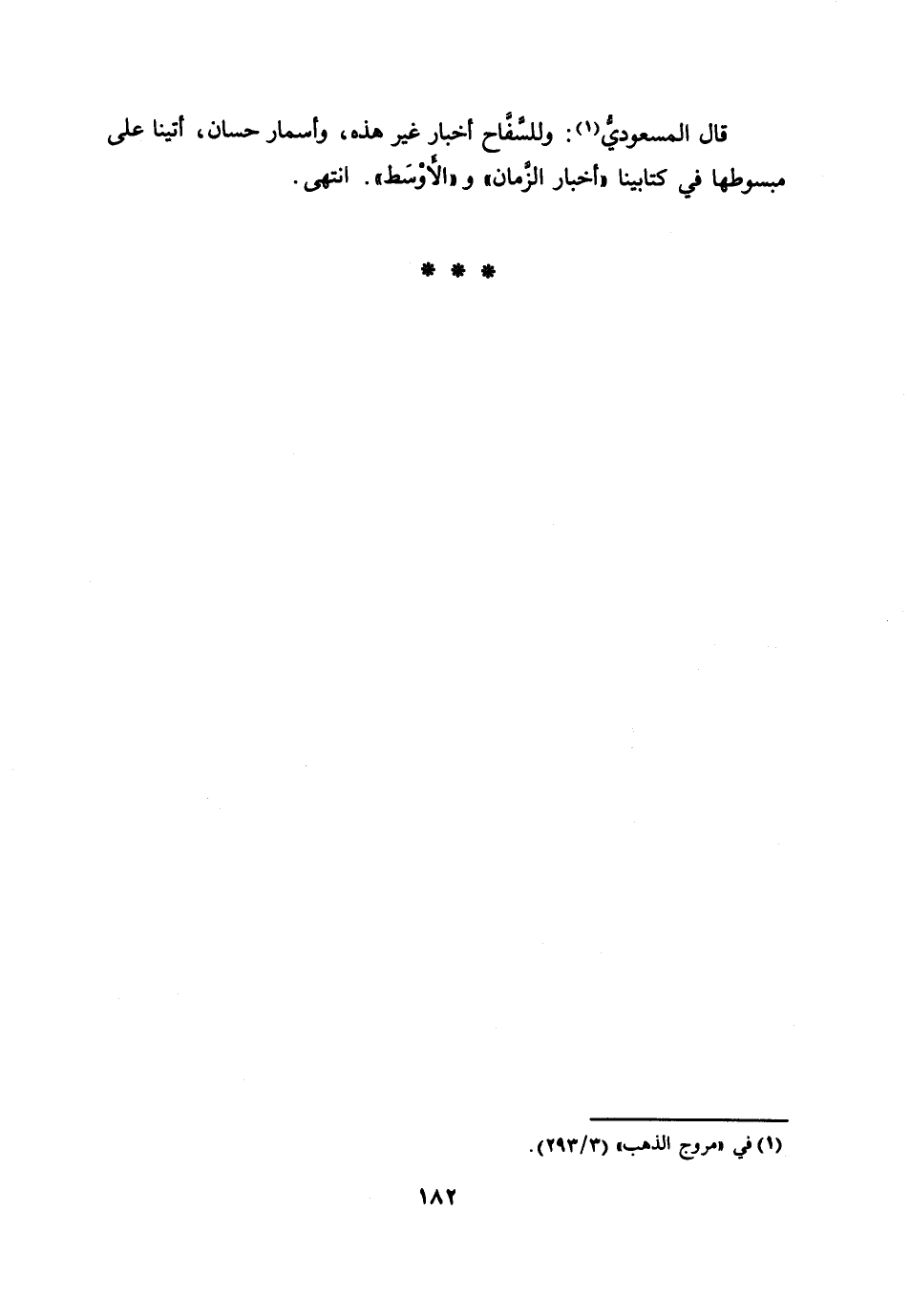 قال المسعوديّ [1] : وللسّفّاح أخبار غير هذه، وأسمار حسان، أتينا على مبسوطها في كتابينا «أخبار الزّمان» و «الأوسط» . انتهى.