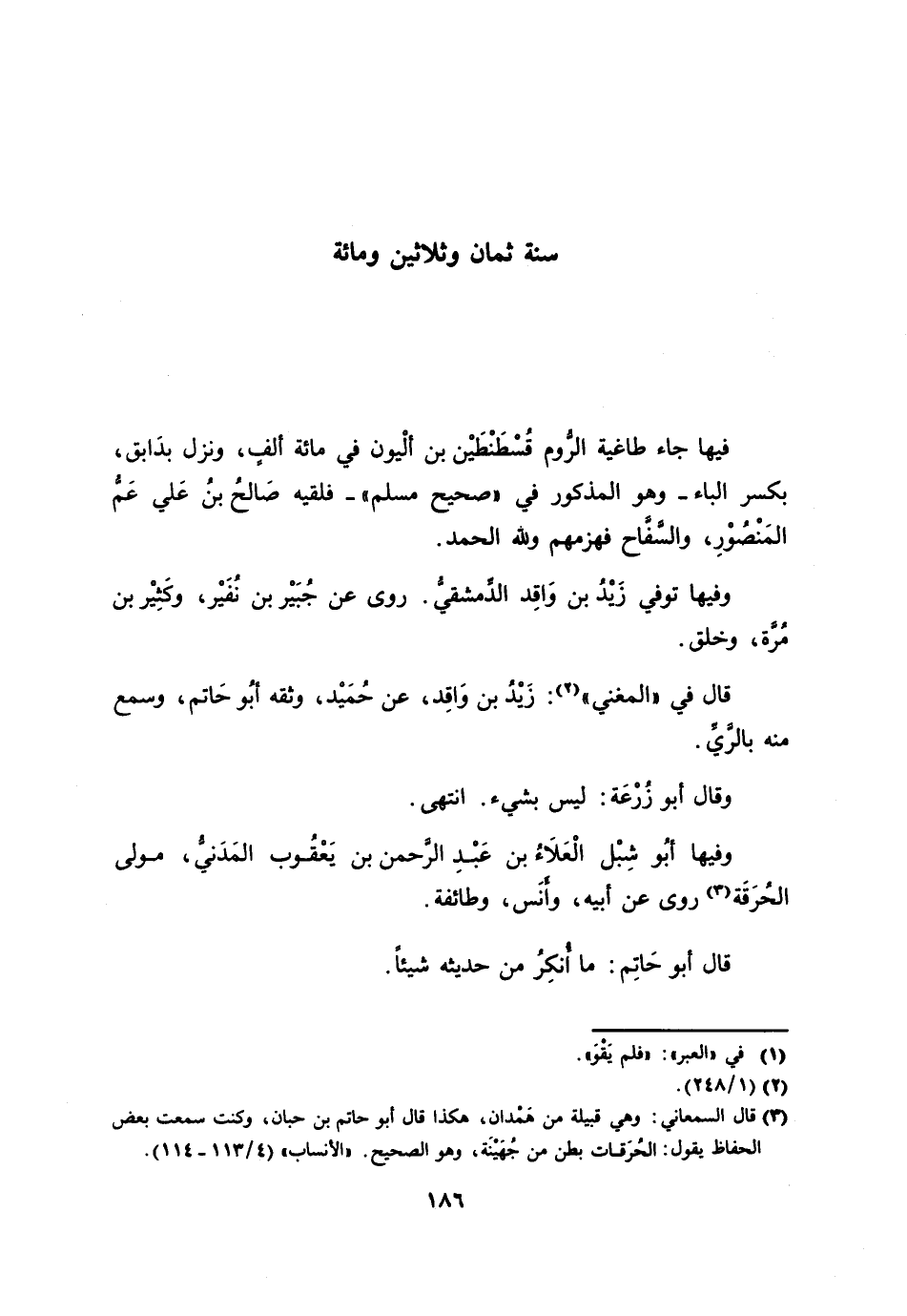 وفيها أبو شبل العلاء بن عبد الرّحمن بن يعقوب المدنيّ، مولى الحرقة [3] روى عن أبيه، وأنس، وطائفة.