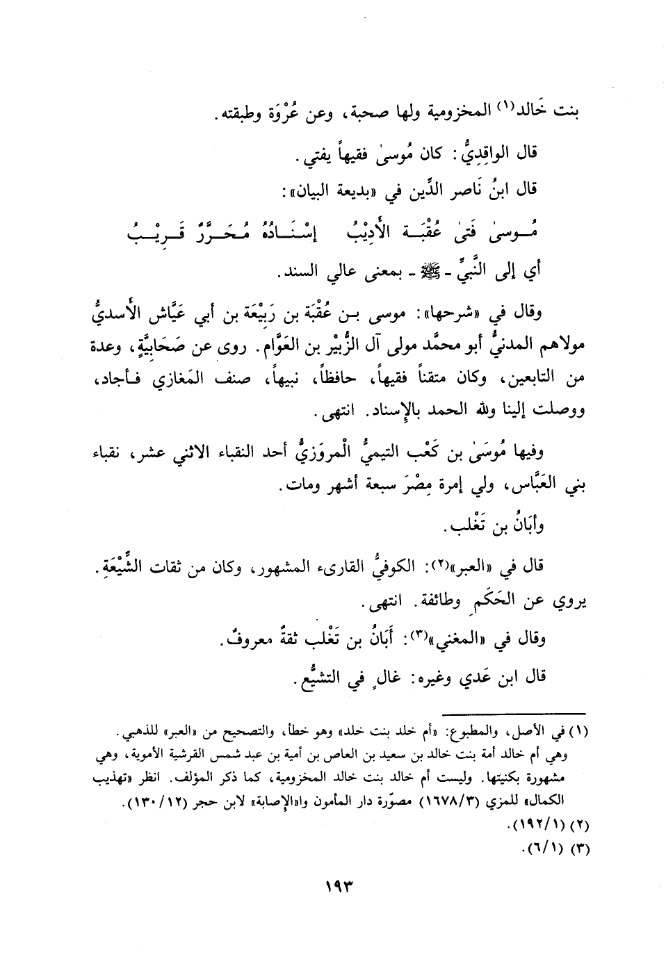 وقال في «شرحها» : موسى بن عقبة بن ربيعة بن أبي عيّاش الأسديّ مولاهم المدنيّ أبو محمّد مولى آل الزّبير بن العوّام. روى عن صحابيّة، وعدة من التابعين، وكان متقنا فقيها، حافظا، نبيها، صنف المغازي فأجاد، ووصلت إلينا ولله الحمد بالإسناد. انتهى.