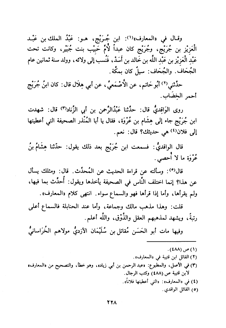 وقال في «المعارف» [1] : ابن جريج، هو: عبد الملك بن عبد العزيز بن جريج، وجريج كان عبدا لأمّ حبيب بنت جبير، وكانت تحت عبد العزيز بن عبد الله بن خالد بن أسد، فنسب إلى ولائه، وولد سنة ثمانين عام الجحاف. والجحاف: سيل كان بمكّة.