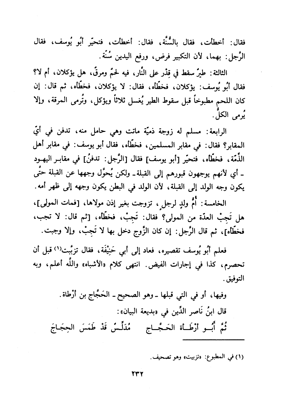 الرابعة: مسلم له زوجة ذميّة ماتت وهي حامل منه، تدفن في أيّ المقابر؟ فقال: في مقابر المسلمين، فخطّأه، فقال أبو يوسف: في مقابر أهل الذّمّة، فخطّأه، فتحيّر [أبو يوسف] فقال [الرّجل: تدفن] في مقابر اليهود- أي لأنهم يوجهون قبورهم إلى القبلة- ولكن يحوّل وجهها عن القبلة حتّى يكون وجه الولد إلى القبلة، لأن الولد في البطن يكون وجهه إلى ظهر أمه.