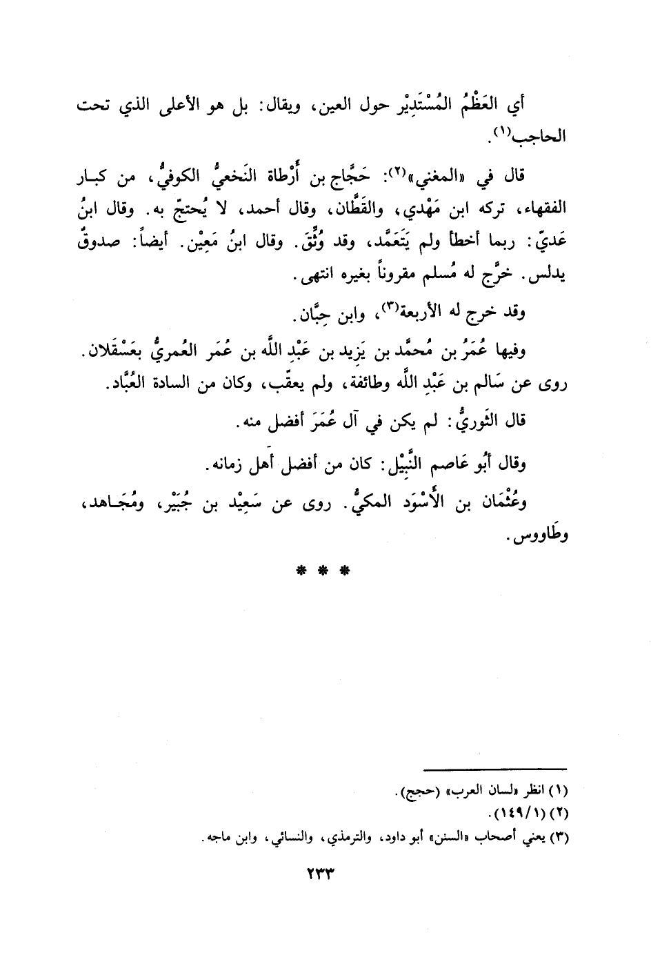قال في «المغني» [2] : حجّاج بن أرطاة النخعيّ الكوفيّ، من كبار الفقهاء، تركه ابن مهدي، والقطّان، وقال أحمد، لا يحتجّ به. وقال ابن عديّ: ربما أخطأ ولم يتعمّد، وقد وثّق. وقال ابن معين. أيضا: صدوق يدلس. خرّج له مسلم مقرونا بغيره انتهى.