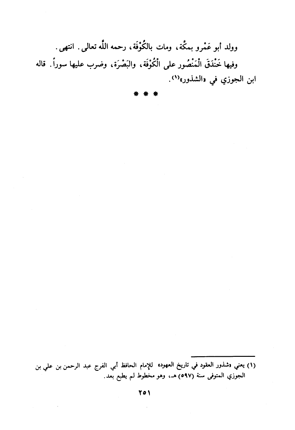 [1] يعني «شذور العقود في تاريخ العهود» للإمام الحافظ أبي الفرج عبد الرحمن بن علي بن الجوزي المتوفى سنة (597) هـ، وهو مخطوط لم يطبع بعد.