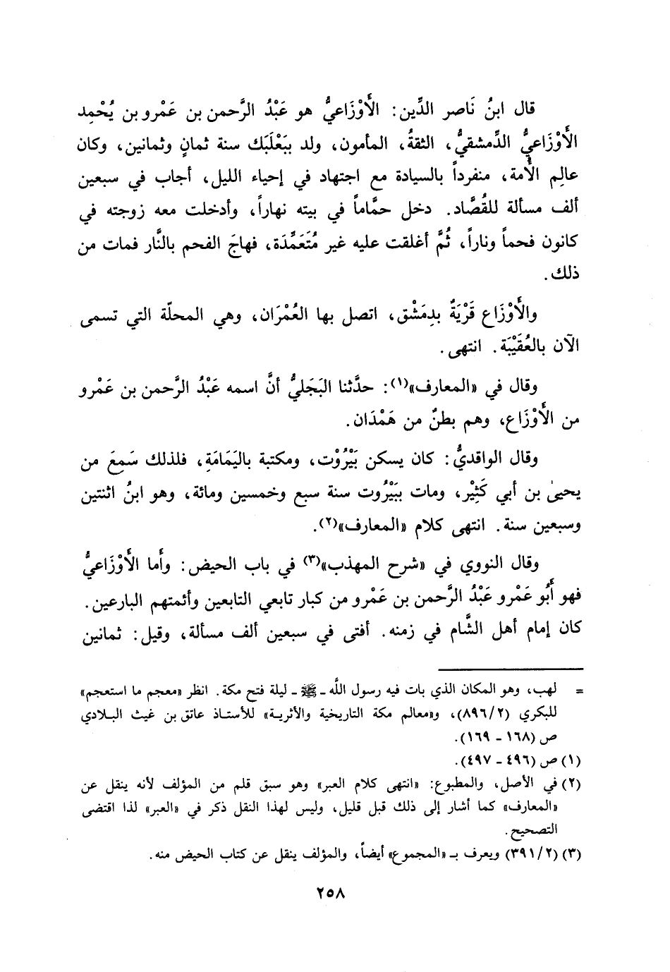 وقال النووي في «شرح المهذب» [3] في باب الحيض: وأما الأوزاعيّ فهو أبو عمرو عبد الرّحمن بن عمرو من كبار تابعي التابعين وأئمتهم البارعين.