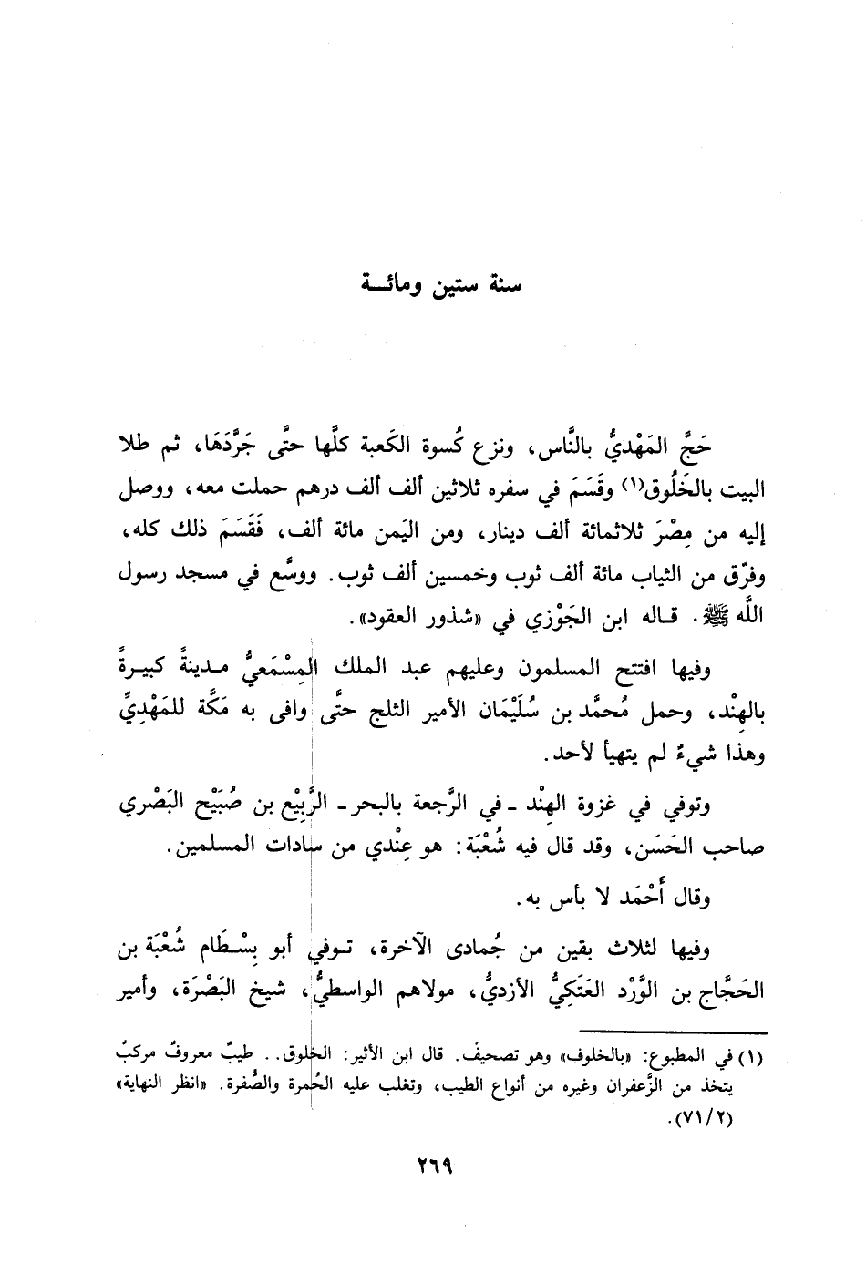 حجّ المهديّ بالنّاس، ونزع كسوة الكعبة كلّها حتّى جرّدها، ثم طلا البيت بالخلوق [1] وقسم في سفره ثلاثين ألف ألف درهم حملت معه، ووصل إليه من مصر ثلاثمائة ألف دينار، ومن اليمن مائة ألف، فقسم ذلك كله، وفرّق من الثياب مائة ألف ثوب وخمسين ألف ثوب. ووسّع في مسجد رسول الله صلّى الله عليه وسلّم. قاله ابن الجوزي في «شذور العقود» .
