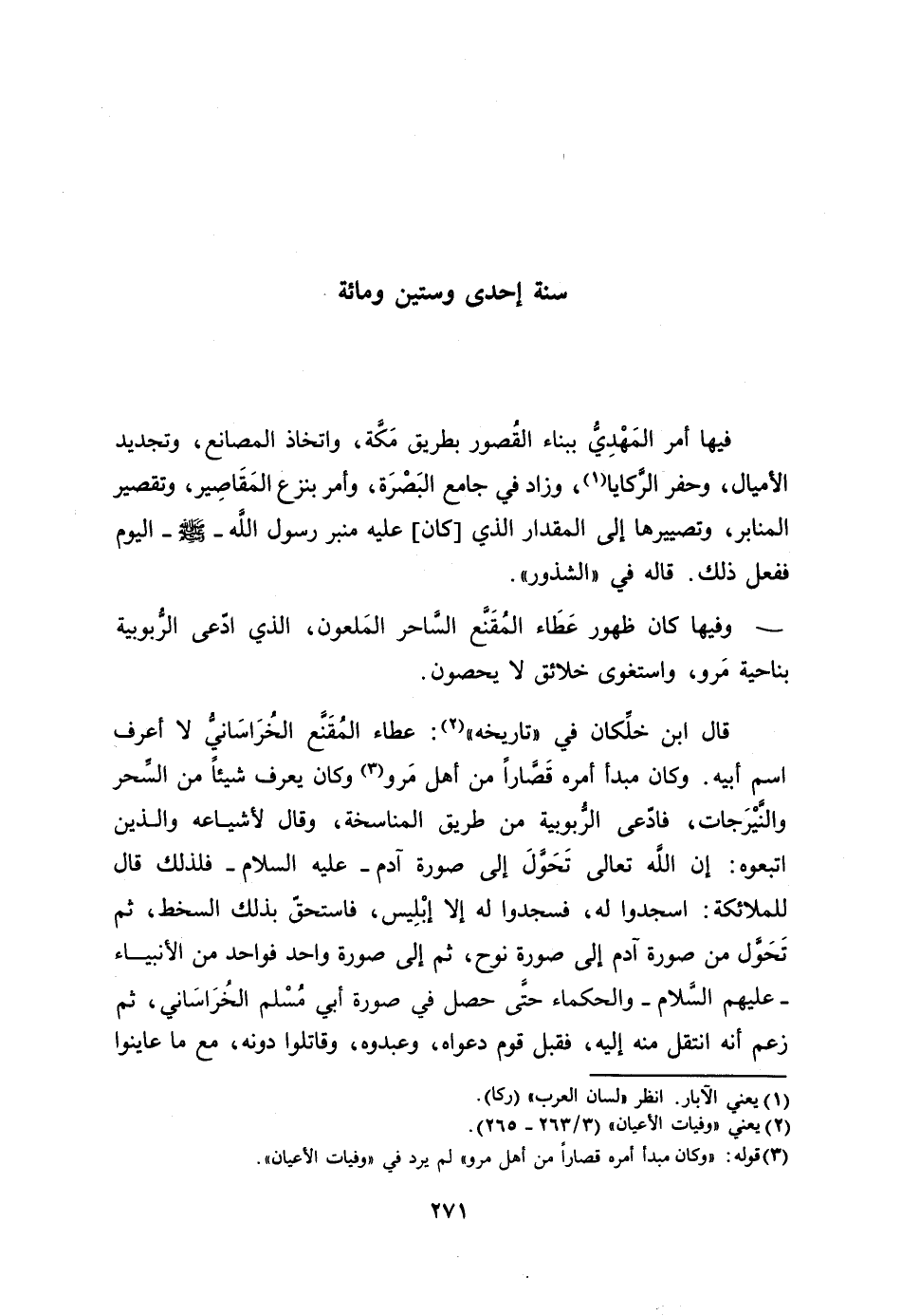 وفيها كان ظهور عطاء المقنّع السّاحر الملعون، الذي ادّعى الرّبوبية بناحية مرو، واستغوى خلائق لا يحصون.