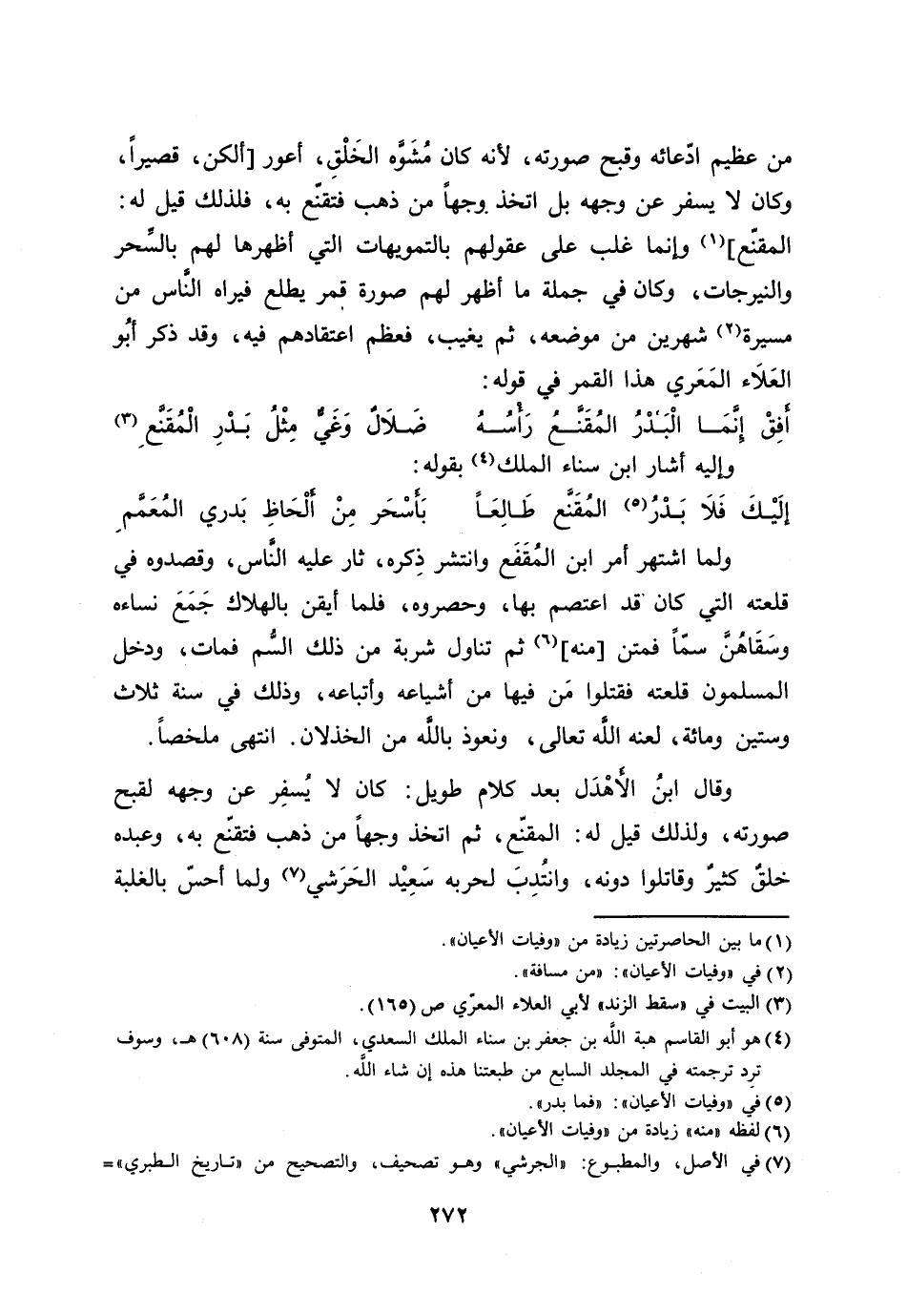المقنّع] [1] وإنما غلب على عقولهم بالتمويهات التي أظهرها لهم بالسّحر والنيرجات، وكان في جملة ما أظهر لهم صورة قمر يطلع فيراه النّاس من مسيرة [2] شهرين من موضعه، ثم يغيب، فعظم اعتقادهم فيه، وقد ذكر أبو العلاء المعري هذا القمر في قوله:
