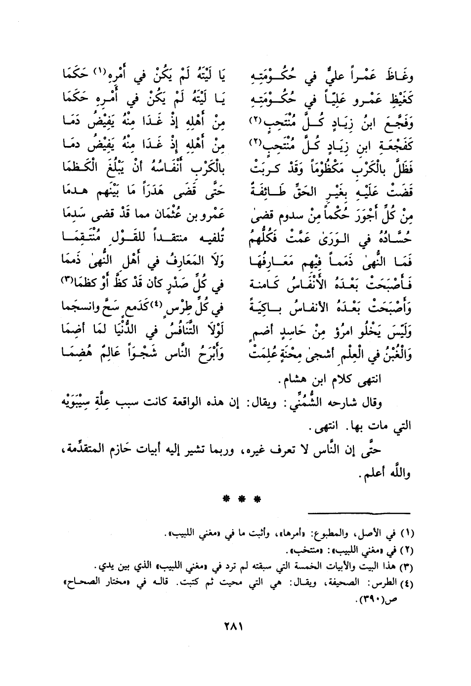 [3] هذا البيت والأبيات الخمسة التي سبقته لم ترد في «مغني اللبيب» الذي بين يدي.