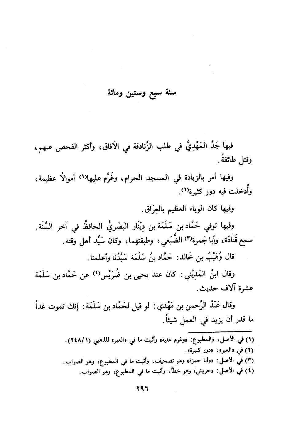 وفيها توفي حمّاد بن سلمة بن دينار البصريّ الحافظ في آخر السّنة.