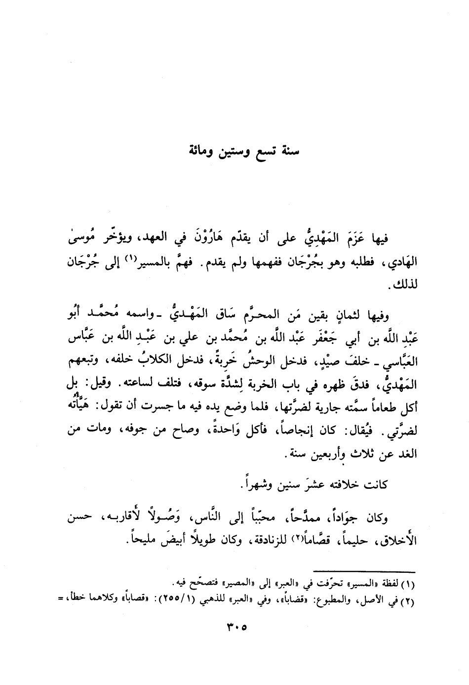وفيها لثمان بقين من المحرّم ساق المهديّ- واسمه محمّد أبو عبد الله بن أبي جعفر عبد الله بن محمّد بن علي بن عبد الله بن عبّاس العبّاسي- خلف صيد، فدخل الوحش خربة، فدخل الكلاب خلفه، وتبعهم المهديّ، فدق ظهره في باب الخربة لشدّة سوقه، فتلف لساعته. وقيل: بل أكل طعاما سمّته جارية لضرّتها، فلما وضع يده فيه ما جسرت أن تقول: هيّأته لضرّتي. فيقال: كان إنجاصا، فأكل واحدة، وصاح من جوفه، ومات من الغد عن ثلاث وأربعين سنة.