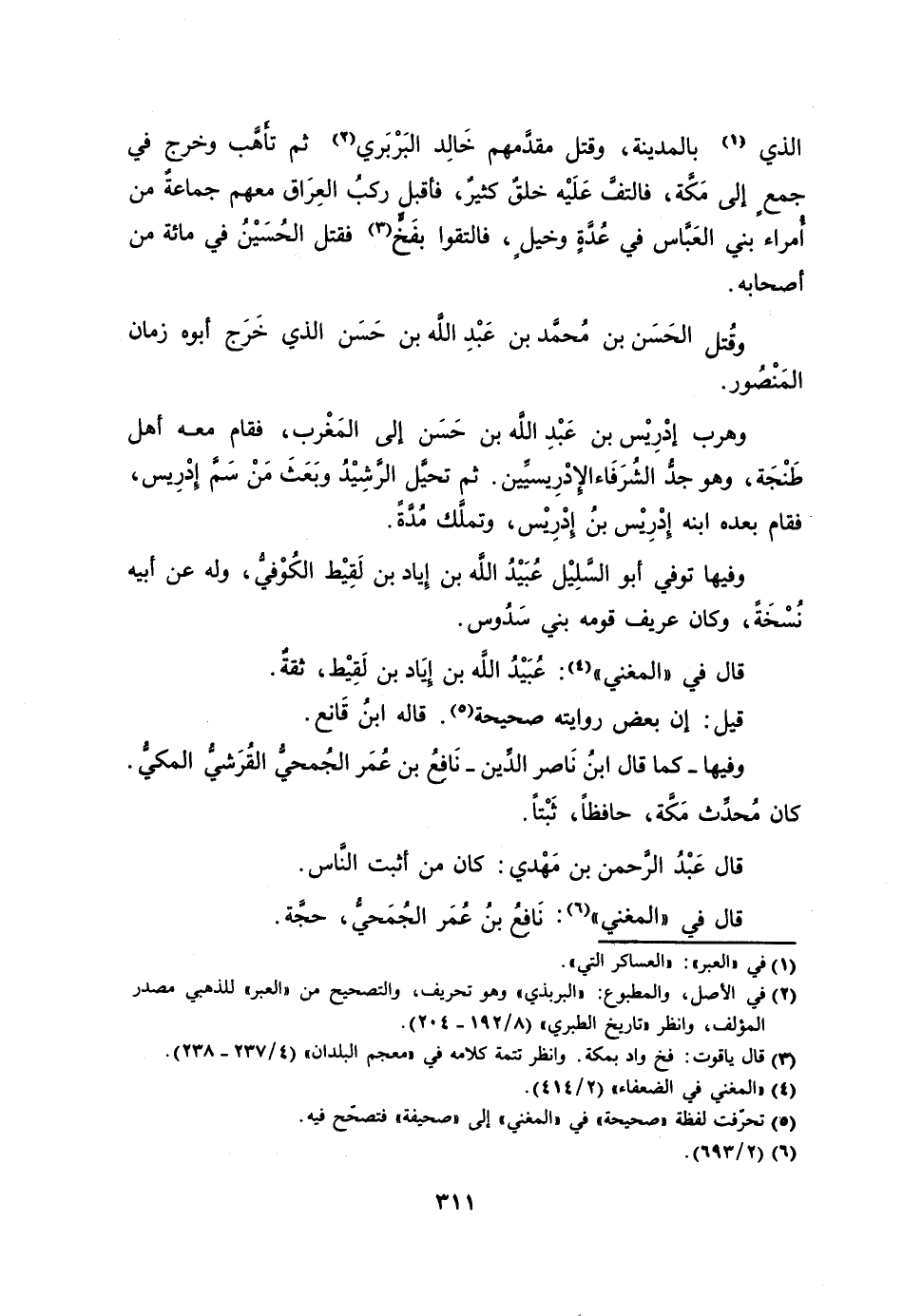 الذي [1] بالمدينة، وقتل مقدّمهم خالد البربري [2] ثم تأهّب وخرج في جمع إلى مكّة، فالتفّ عليه خلق كثير، فأقبل ركب العراق معهم جماعة من أمراء بني العبّاس في عدّة وخيل، فالتقوا بفخّ [3] فقتل الحسين في مائة من أصحابه.