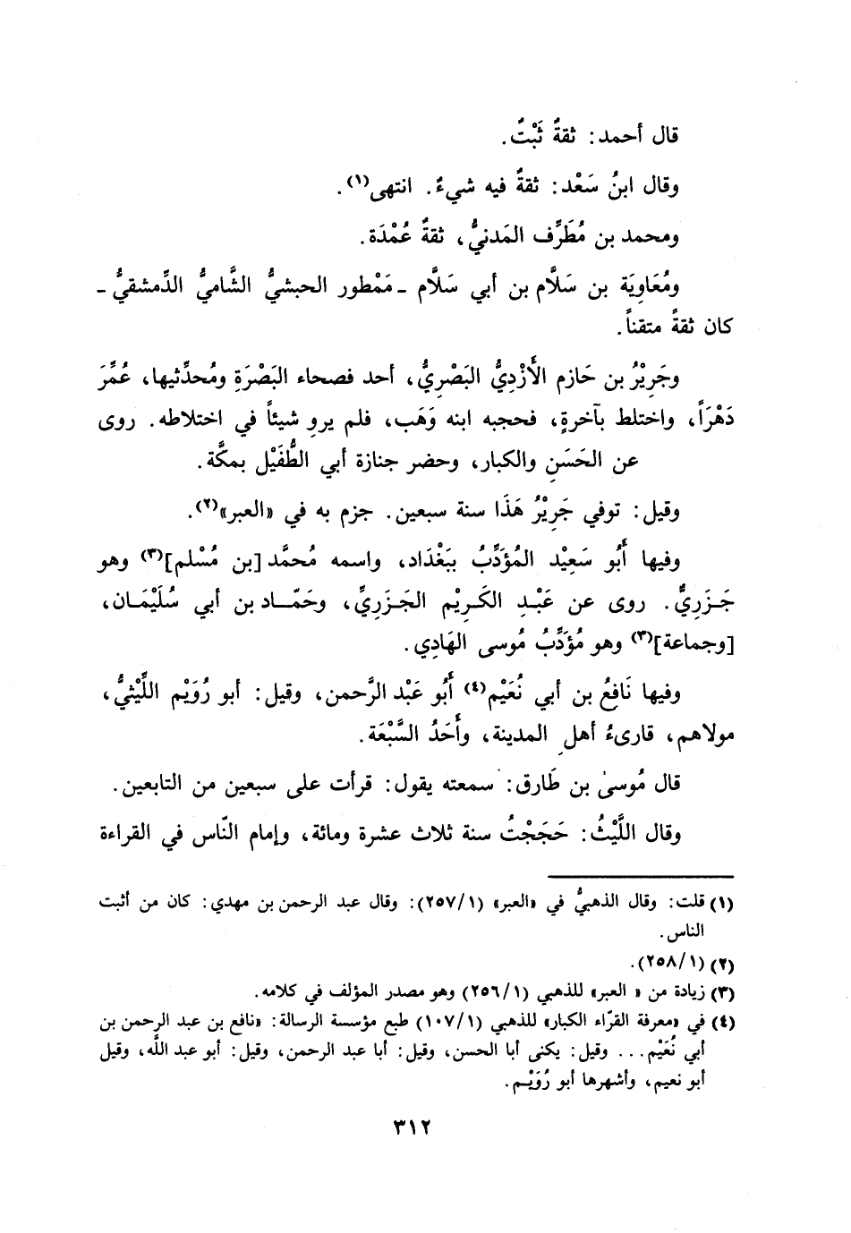 وفيها نافع بن أبي نعيم [4] أبو عبد الرّحمن، وقيل: أبو رويم اللّيثيّ، مولاهم، قارئ أهل المدينة، وأحد السّبعة.