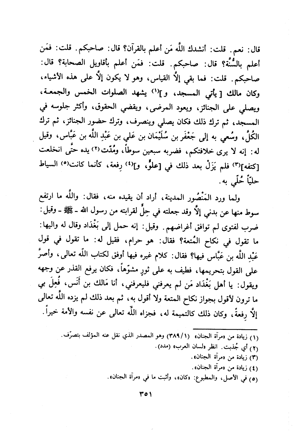 ما تقول في نكاح المتعة؟ فقال: هو حرام، فقيل له: ما تقول في قول عبد الله بن عبّاس فيها؟ فقال: كلام غيره فيها أوفق لكتاب الله تعالى، وأصرّ على القول بتحريمها، فطيف به على ثور مشوّها، فكان يرفع القذر عن وجهه ويقول: يا أهل بغداد من لم يعرفني فليعرفني، أنا مالك بن أنس، فعل بي ما ترون لأقول بجواز نكاح المتعة ولا أقول به، ثم بعد ذلك لم يزده الله تعالى إلّا رفعة، وكان ذلك كالتميمة له، فجزاه الله تعالى عن نفسه والأمة خيرا.