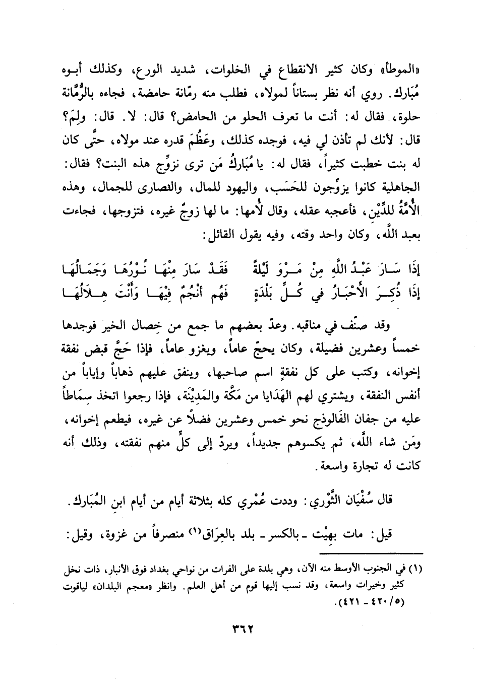 «الموطأ» وكان كثير الانقطاع في الخلوات، شديد الورع، وكذلك أبوه مبارك. روي أنه نظر بستانا لمولاه، فطلب منه رمّانة حامضة، فجاءه بالرّمّانة حلوة، فقال له: أنت ما تعرف الحلو من الحامض؟ قال: لا. قال: ولم؟