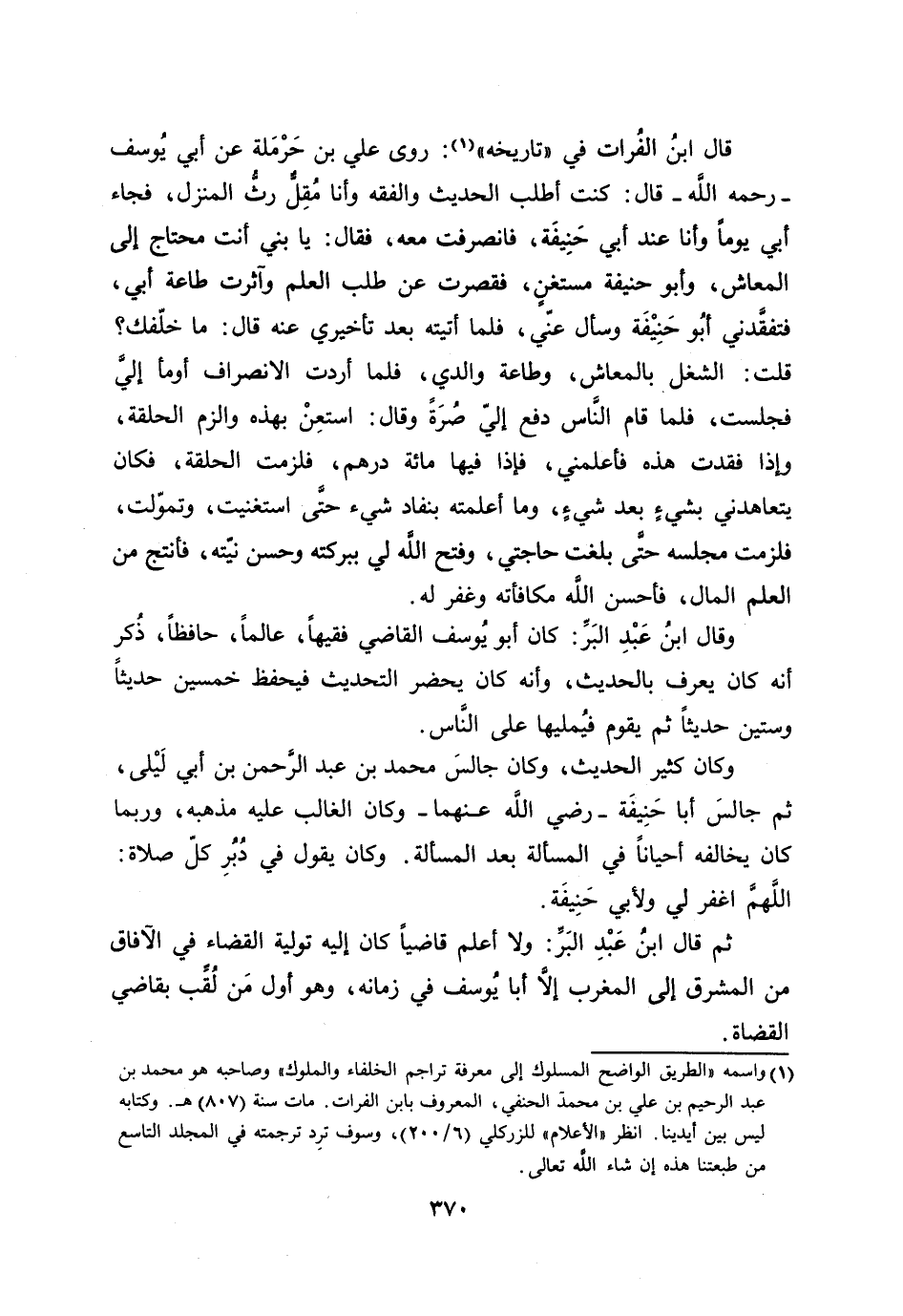 قال ابن الفرات في «تاريخه» [1] : روى علي بن حرملة عن أبي يوسف- رحمه الله- قال: كنت أطلب الحديث والفقه وأنا مقلّ رثّ المنزل، فجاء أبي يوما وأنا عند أبي حنيفة، فانصرفت معه، فقال: يا بني أنت محتاج إلي المعاش، وأبو حنيفة مستغن، فقصرت عن طلب العلم وآثرت طاعة أبي، فتفقّدني أبو حنيفة وسأل عنّي، فلما أتيته بعد تأخيري عنه قال: ما خلّفك؟