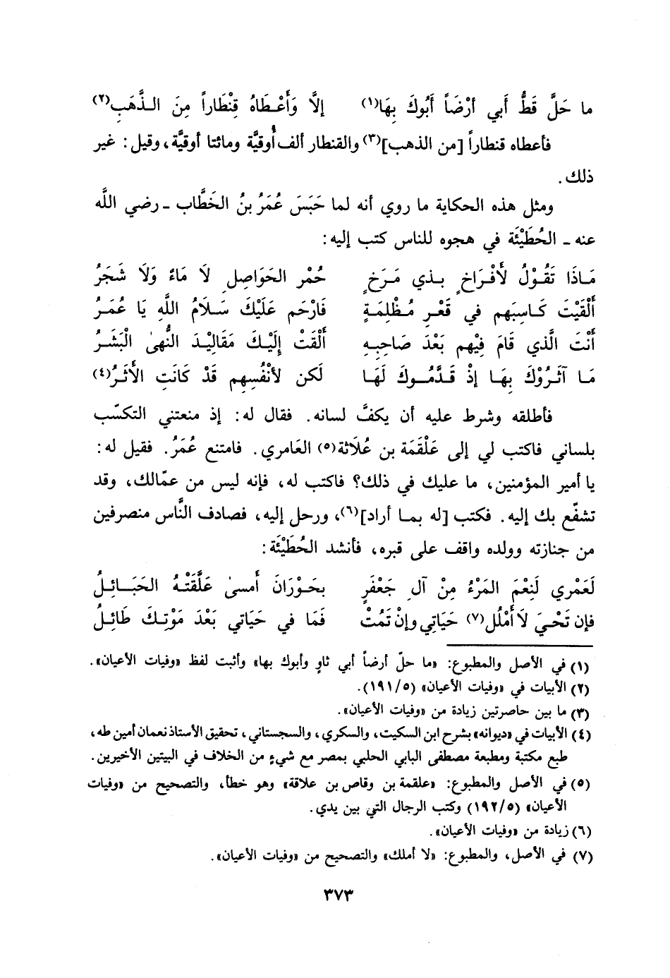ومثل هذه الحكاية ما روي أنه لما حبس عمر بن الخطّاب- رضي الله عنه- الحطيئة في هجوه للناس كتب إليه: