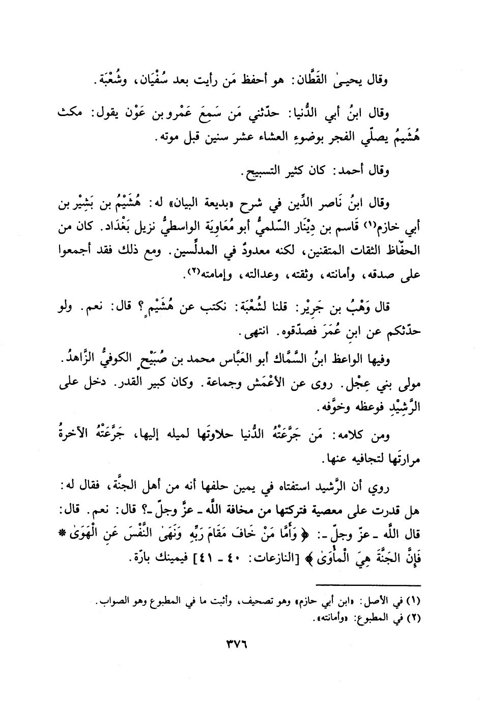 وقال ابن ناصر الدّين في شرح «بديعة البيان» له: هشيم بن بشير بن أبي خازم [1] قاسم بن دينار السّلميّ أبو معاوية الواسطيّ نزيل بغداد. كان من الحفّاظ الثقات المتقنين، لكنه معدود في المدلّسين، ومع ذلك فقد أجمعوا على صدقه، وأمانته، وثقته، وعدالته، وإمامته [2] .