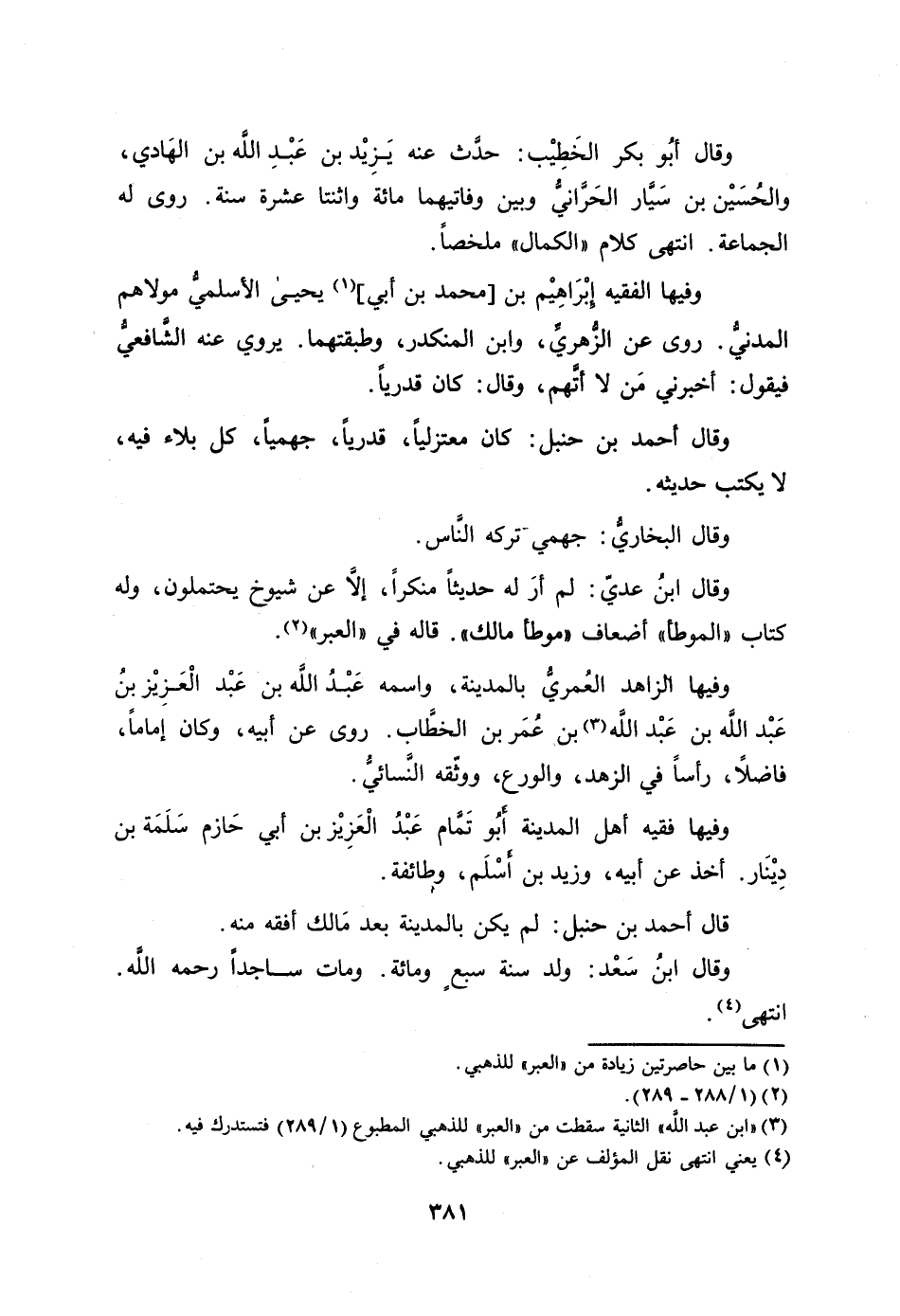 وفيها الفقيه إبراهيم بن [محمد بن أبي] [1] يحيى الأسلميّ مولاهم المدنيّ. روى عن الزّهريّ، وابن المنكدر، وطبقتهما. يروي عنه الشّافعيّ فيقول: أخبرني من لا أتّهم، وقال: كان قدريا.
