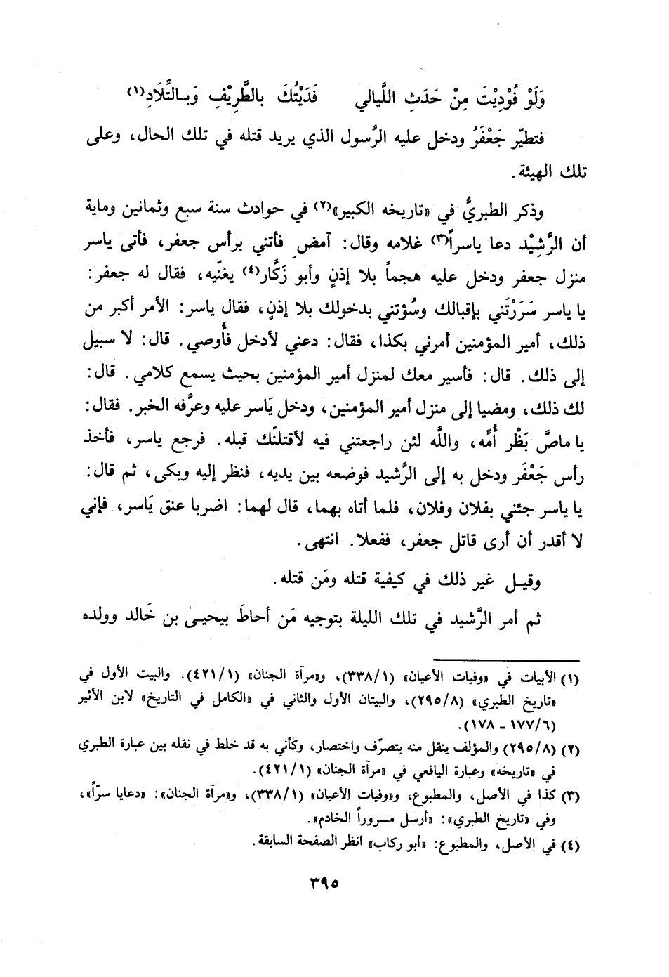 يا ياسر جئني بفلان وفلان، فلما أتاه بهما، قال لهما: اضربا عنق ياسر، فإني لا أقدر أن أرى قاتل جعفر، ففعلا. انتهى.