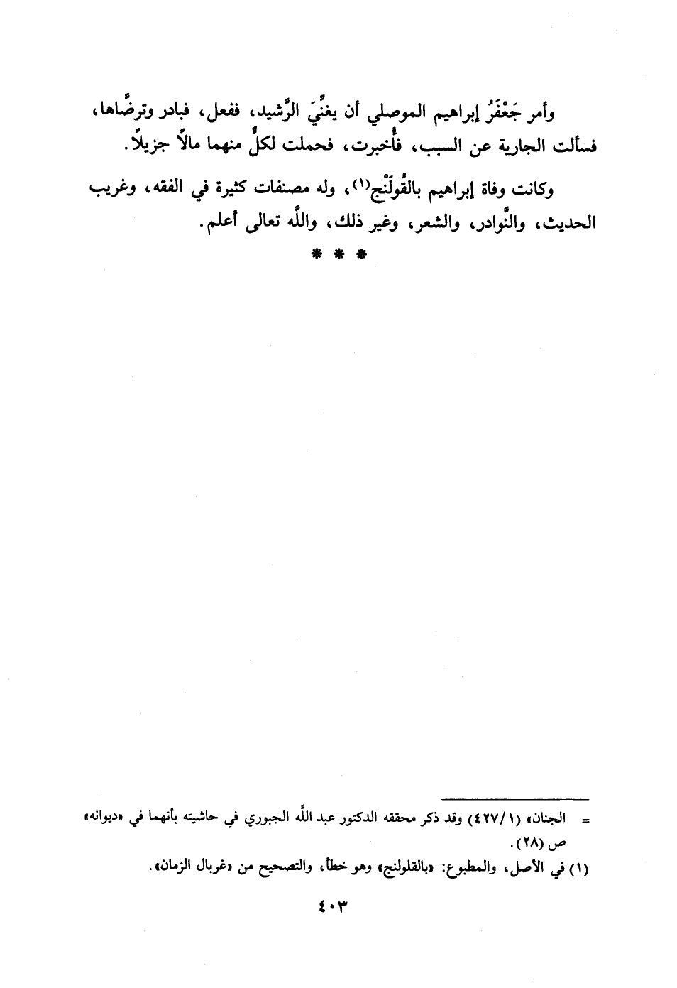 وأمر جعفر إبراهيم الموصلي أن يغنّي الرّشيد، ففعل، فبادر وترضّاها، فسألت الجارية عن السبب، فأخبرت، فحملت لكلّ منهما مالا جزيلا.