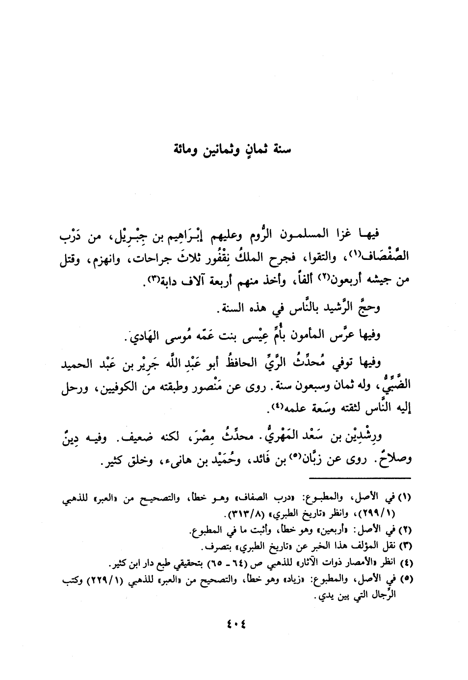 فيها غزا المسلمون الرّوم وعليهم إبراهيم بن جبريل، من درب الصّفصاف [1] ، والتقوا، فجرح الملك نقفور ثلاث جراحات، وانهزم، وقتل من جيشه أربعون [2] ألفا، وأخذ منهم أربعة آلاف دابة [3] .
