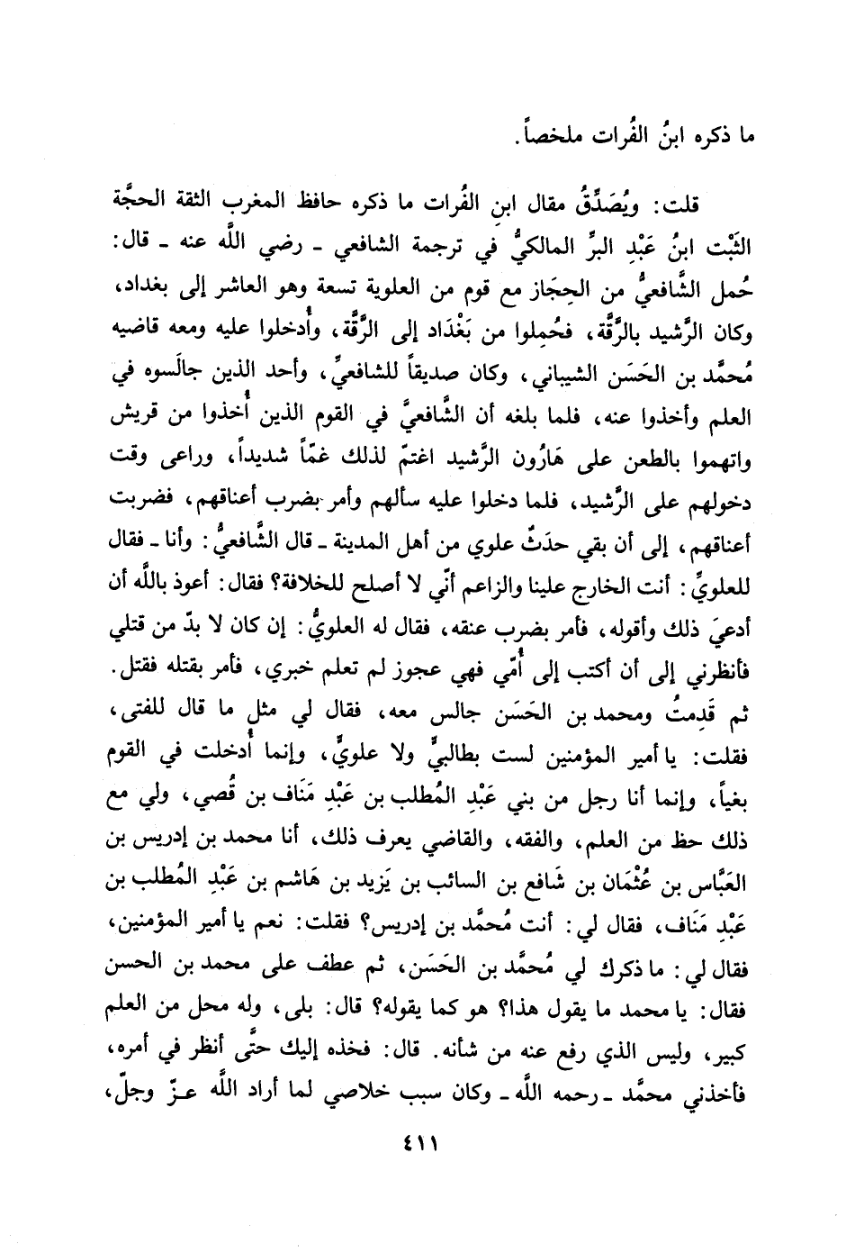 قلت: ويصدّق مقال ابن الفرات ما ذكره حافظ المغرب الثقة الحجّة الثبت ابن عبد البرّ المالكيّ في ترجمة الشافعي- رضي الله عنه- قال: