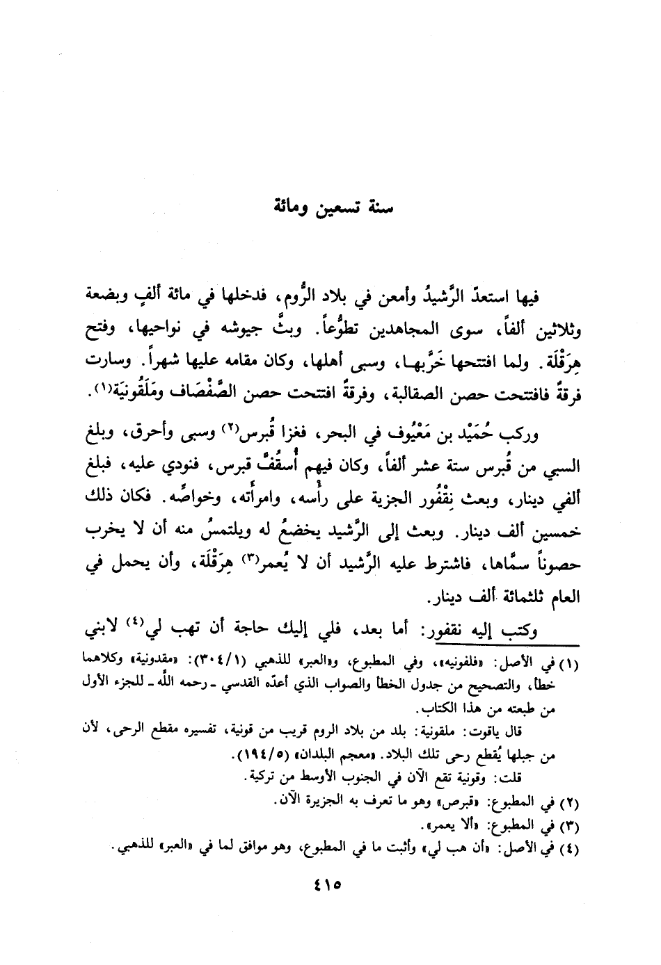 وركب حميد بن معيوف في البحر، فغزا قبرس [2] وسبى وأحرق، وبلغ السبي من قبرس ستة عشر ألفا، وكان فيهم أسقفّ قبرس، فنودي عليه، فبلغ ألفي دينار، وبعث نقفور الجزية على رأسه، وامرأته، وخواصّه. فكان ذلك خمسين ألف دينار. وبعث إلى الرّشيد يخضع له ويلتمس منه أن لا يخرب حصونا سمّاها، فاشترط عليه الرّشيد أن لا يعمر [3] هرقلة، وأن يحمل في العام ثلاثمائة ألف دينار.