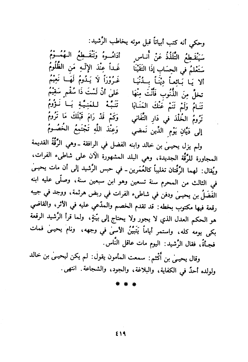 ولم يزل يحيى بن خالد وابنه الفضل في الرافقة- وهي الرّقّة القديمة المجاورة للرّقّة الجديدة، وهي البلد المشهورة الآن على شاطئ الفرات، ويقال: لهما الرّقّتان تغليبا كالعمرين- في حبس الرّشيد إلى أن مات يحيى في الثالث من المحرم سنة تسعين وهو ابن سبعين سنة، وصلّى عليه ابنه الفضل بن يحيى ودفن في شاطئ الفرات في ربض هرثمة، ووجد في جيبه رقعة فيها مكتوب بخطه: قد تقدم الخصم والمدّعي عليه في الأثر، والقاضي هو الحكم العدل الذي لا يجور ولا يحتاج إلى بيّنة، ولما قرأ الرّشيد الرقعة بكى يومه كله، واستمر أياما يتبيّن الأسى في وجهه، ونام يحيى فمات فجأة، فقال الرّشيد: اليوم مات عاقل النّاس.
