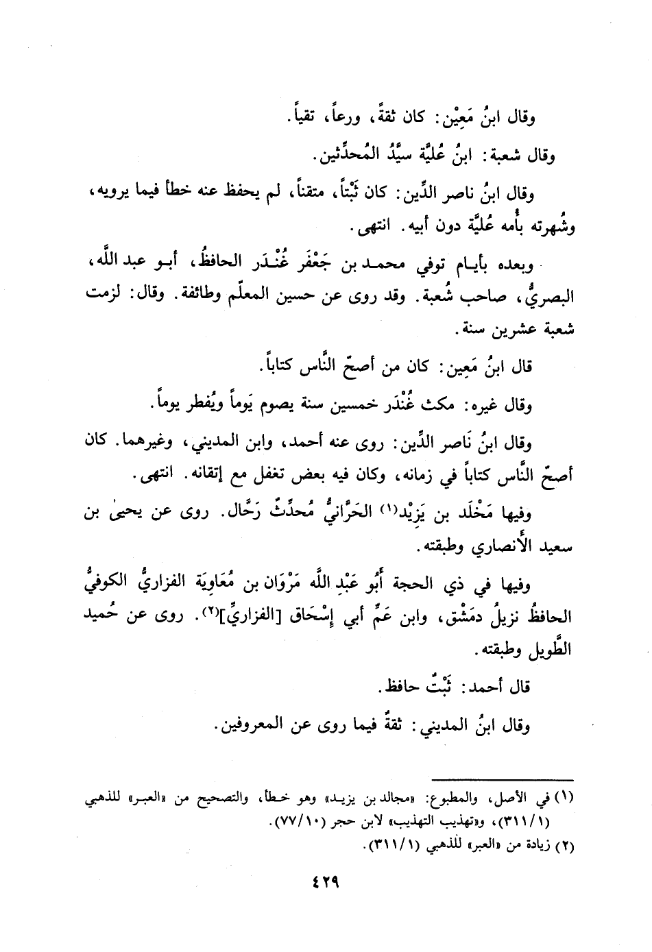 وقال ابن ناصر الدّين: روى عنه أحمد، وابن المديني، وغيرهما. كان أصحّ النّاس كتابا في زمانه، وكان فيه بعض تغفل مع إتقانه. انتهى.