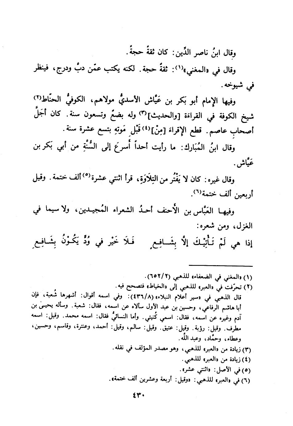 وفيها الإمام أبو بكر بن عيّاش الأسديّ مولاهم، الكوفيّ الحنّاط [2] شيخ الكوفة في القراءة [والحديث] [3] وله بضع وتسعون سنة. كان أجلّ أصحاب عاصم. قطع الإقراء [من] [4] قبل موته بتسع عشرة سنة.