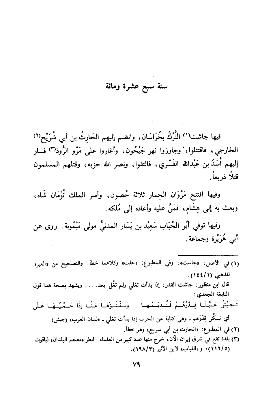 فيها جاشت [1] التّرك بخراسان، وانضم إليهم الحارث بن أبي شريح [2] الخارجي، فاقتتلوا، وجاوزوا نهر جيحون، وأغاروا على مرو الرّوذ [3] فسار إليهم أسد بن عبد الله القسري، فالتقوا، ونصر الله حزبه، وقتلهم المسلمون قتلا ذريعا.
