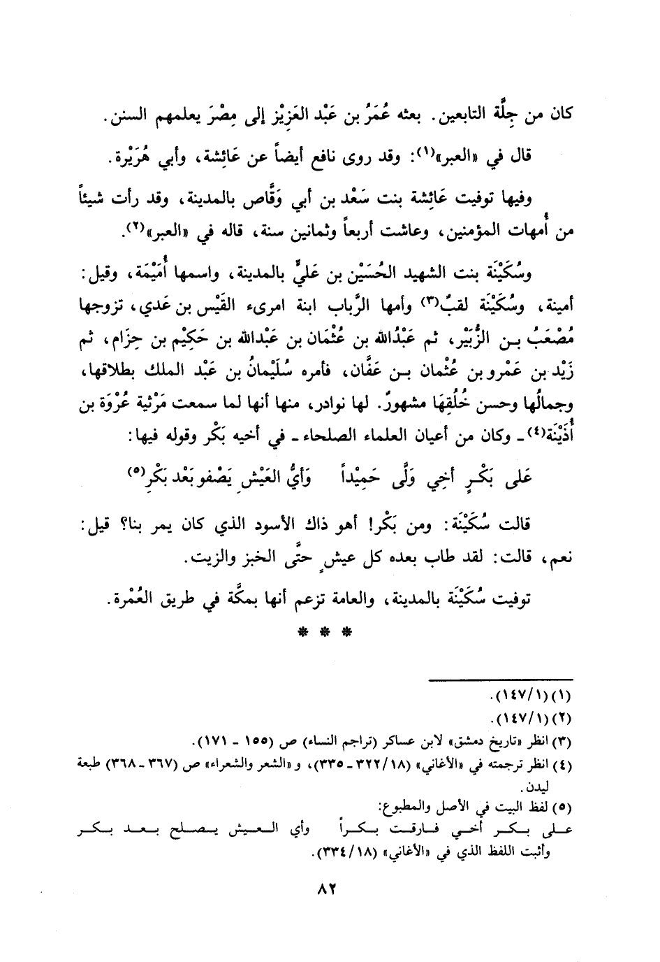 أمينة، وسكينة لقب [3] وأمها الرّباب ابنة امرئ القيس بن عدي، تزوجها مصعب بن الزّبير، ثم عبد الله بن عثمان بن عبد الله بن حكيم بن حزام، ثم زيد بن عمرو بن عثمان بن عفّان، فأمره سليمان بن عبد الملك بطلاقها، وجمالها وحسن خلقها مشهور. لها نوادر، منها أنها لما سمعت مرثية عروة بن أذينة [4]- وكان من أعيان العلماء الصلحاء- في أخيه بكر وقوله فيها: