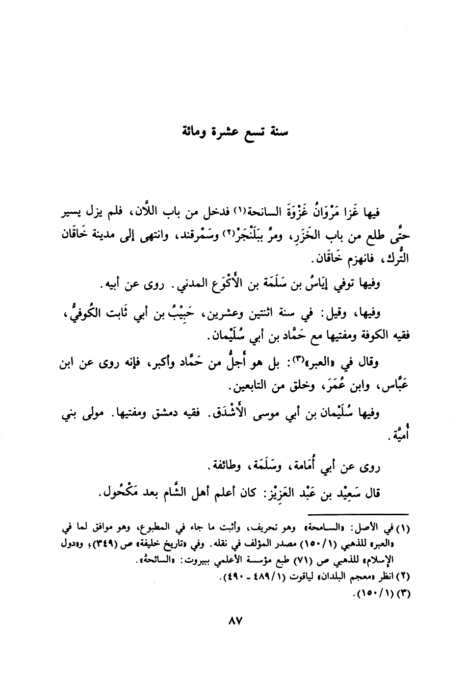 [1] في الأصل: «السامحة» وهو تحريف، وأثبت ما جاء في المطبوع، وهو موافق لما في «العبر» للذهبي (1/ 150) مصدر المؤلف في نقله. وفي «تاريخ خليفة» ص (349) ، و «دول الإسلام» للذهبي ص (71) طبع مؤسسة الأعلمي ببيروت: «السائحة» .