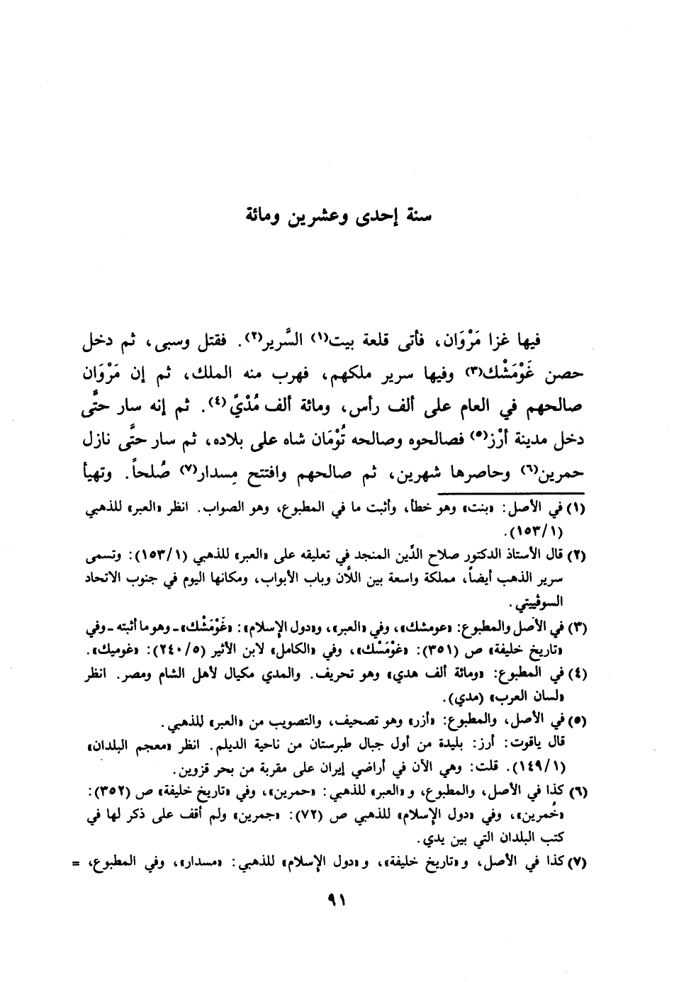 فيها غزا مروان، فأتى قلعة بيت [1] السّرير [2] . فقتل وسبى، ثم دخل حصن غومشك [3] وفيها سرير ملكهم، فهرب منه الملك، ثم إن مروان صالحهم في العام على ألف رأس، ومائة ألف مدي [4] . ثم إنه سار حتّى دخل مدينة أرز [5] فصالحوه وصالحه تومان شاه على بلاده، ثم سار حتّى نازل حمرين [6] وحاصرها شهرين، ثم صالحهم وافتتح مسدار [7] صلحا. وتهيأ