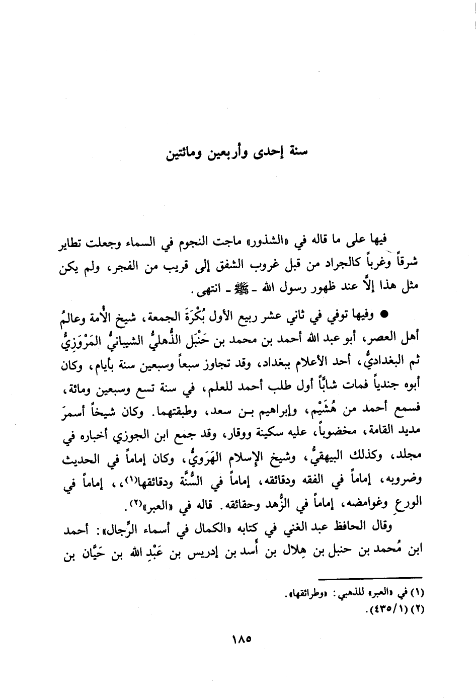 وفيها توفي في ثاني عشر ربيع الأول بكرة الجمعة، شيخ الأمة وعالم أهل العصر، أبو عبد الله أحمد بن محمد بن حنبل الذّهليّ الشيبانيّ المروزيّ ثم البغداديّ، أحد الأعلام ببغداد، وقد تجاوز سبعا وسبعين سنة بأيام، وكان أبوه جنديا فمات شابّا أول طلب أحمد للعلم، في سنة تسع وسبعين ومائة، فسمع أحمد من هشيم، وإبراهيم بن سعد، وطبقتهما. وكان شيخا أسمر مديد القامة، مخضوبا، عليه سكينة ووقار، وقد جمع ابن الجوزي أخباره في مجلد، وكذلك البيهقيّ، وشيخ الإسلام الهرويّ، وكان إماما في الحديث وضروبه، إماما في الفقه ودقائقه، إماما في السّنّة ودقائقها [1] ،، إماما في الورع وغوامضه، إماما في الزّهد وحقائقه. قاله في «العبر» [2] .