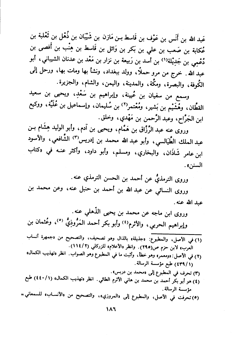 عبد الله بن أنس بن عوف بن قاسط بن مازن بن شيبان بن ذهل بن ثعلبة بن عكابة بن صعب بن علي بن بكر بن وائل بن قاسط بن هنب بن أفصى بن دعمي بن جديلة [1] بن أسد بن ربيعة بن نزار بن معد بن عدنان الشيباني، أبو عبد الله. خرج من مرو حملا، وولد ببغداد، ونشأ بها ومات بها، ورحل إلى الكوفة، والبصرة، ومكّة، والمدينة، واليمن، والشام، والجزيرة.