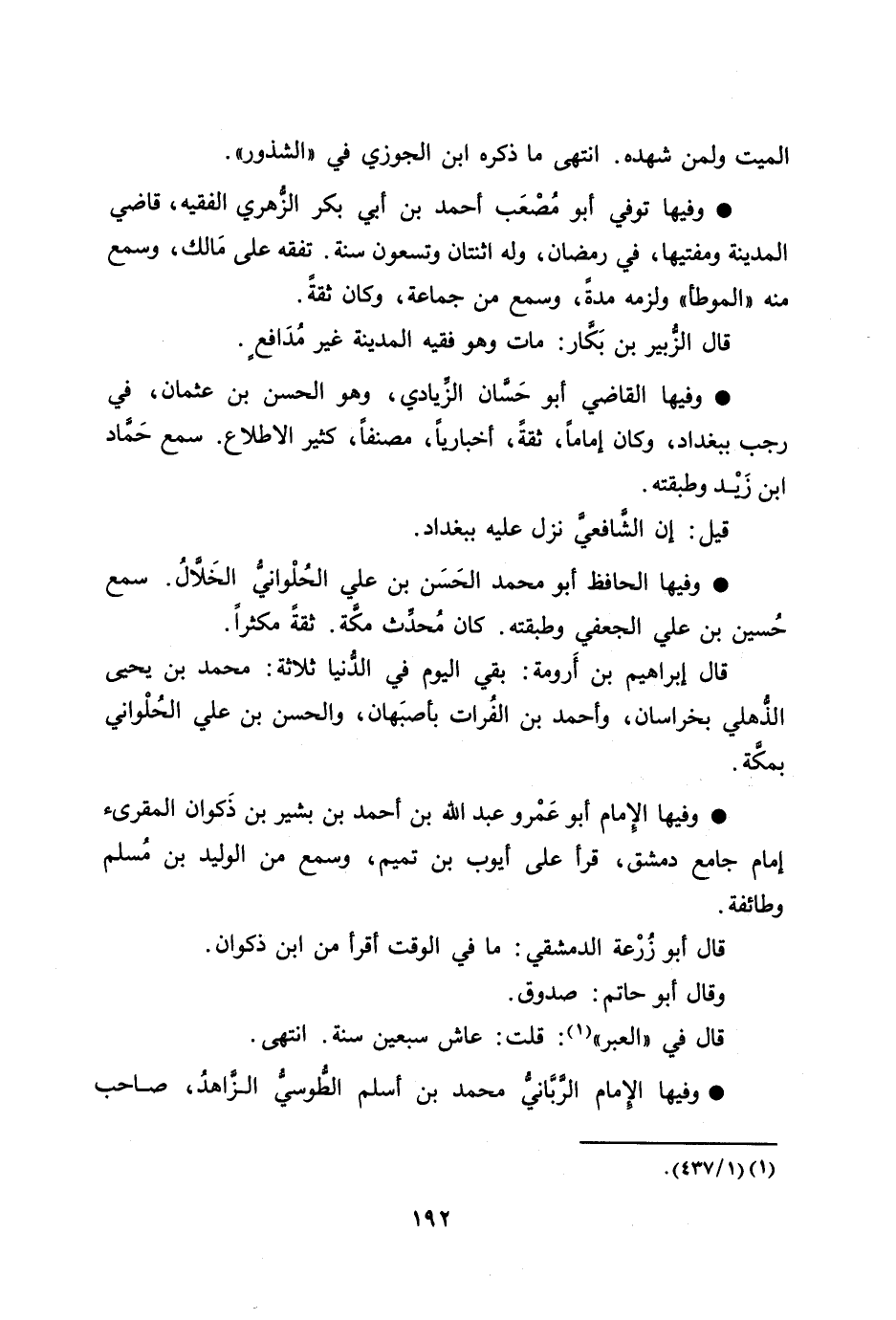 وفيها القاضي أبو حسّان الزّيادي، وهو الحسن بن عثمان، في رجب ببغداد، وكان إماما، ثقة، أخباريا، مصنفا، كثير الاطلاع. سمع حمّاد ابن زيد وطبقته.
