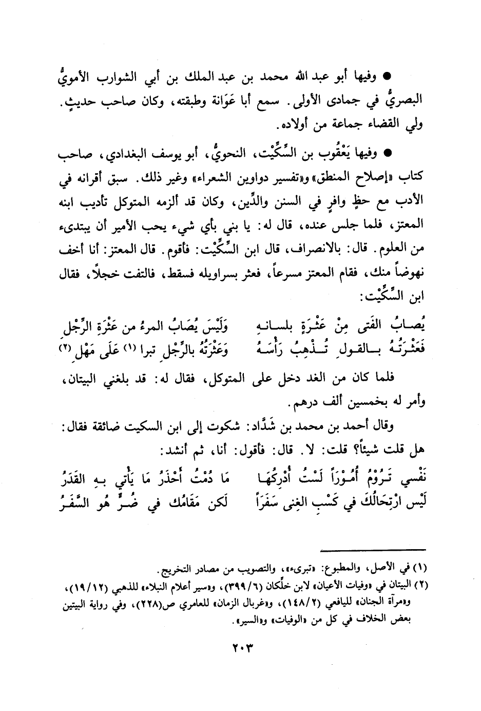 وفيها يعقوب بن السّكّيت، النحويّ، أبو يوسف البغدادي، صاحب كتاب «إصلاح المنطق» و «تفسير دواوين الشعراء» وغير ذلك. سبق أقرانه في الأدب مع حظ وافر في السنن والدّين، وكان قد ألزمه المتوكل تأديب ابنه المعتز، فلما جلس عنده، قال له: يا بني بأي شيء يحب الأمير أن يبتدئ من العلوم. قال: بالانصراف، قال ابن السّكّيت: فأقوم. قال المعتز: أنا أخف نهوضا منك، فقام المعتز مسرعا، فعثر بسراويله فسقط، فالتفت خجلا، فقال ابن السّكّيت: