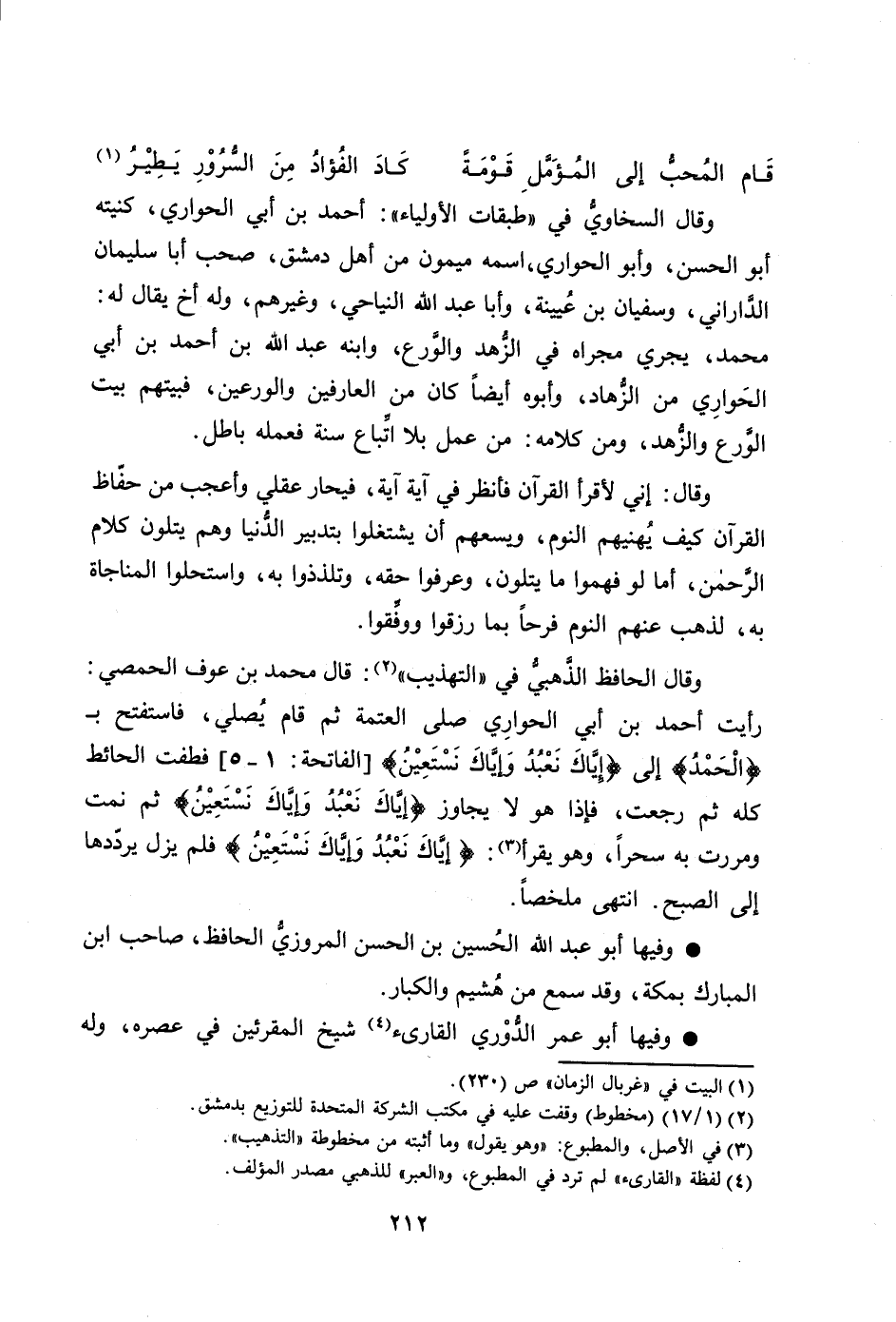 رأيت أحمد بن أبي الحواري صلى العتمة ثم قام يصلي، فاستفتح ب الْحَمْدُ 1: 2 إلى إِيَّاكَ نَعْبُدُ وَإِيَّاكَ نَسْتَعِينُ 1: 5 [الفاتحة: 5- 1] فطفت الحائط كله ثم رجعت، فإذا هو لا يجاوز إِيَّاكَ نَعْبُدُ وَإِيَّاكَ نَسْتَعِينُ 1: 5 ثم نمت ومررت به سحرا، وهو يقرأ [3] : إِيَّاكَ نَعْبُدُ وَإِيَّاكَ نَسْتَعِينُ 1: 5 فلم يزل يردّدها إلى الصبح. انتهى ملخصا.