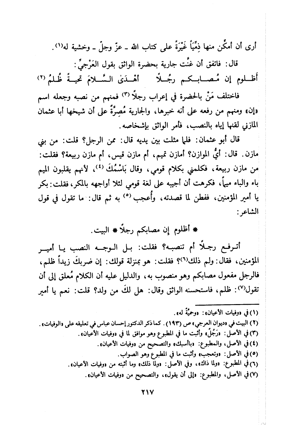 فاختلف من بالحضرة في إعراب رجلا [3] فمنهم من نصبه وجعله اسم «إن» ومنهم من رفعه على أنه خبرها، والجارية مصرّة على أن شيخها أبا عثمان المازني لقنها إياه بالنصب، فأمر الواثق بإشخاصه.