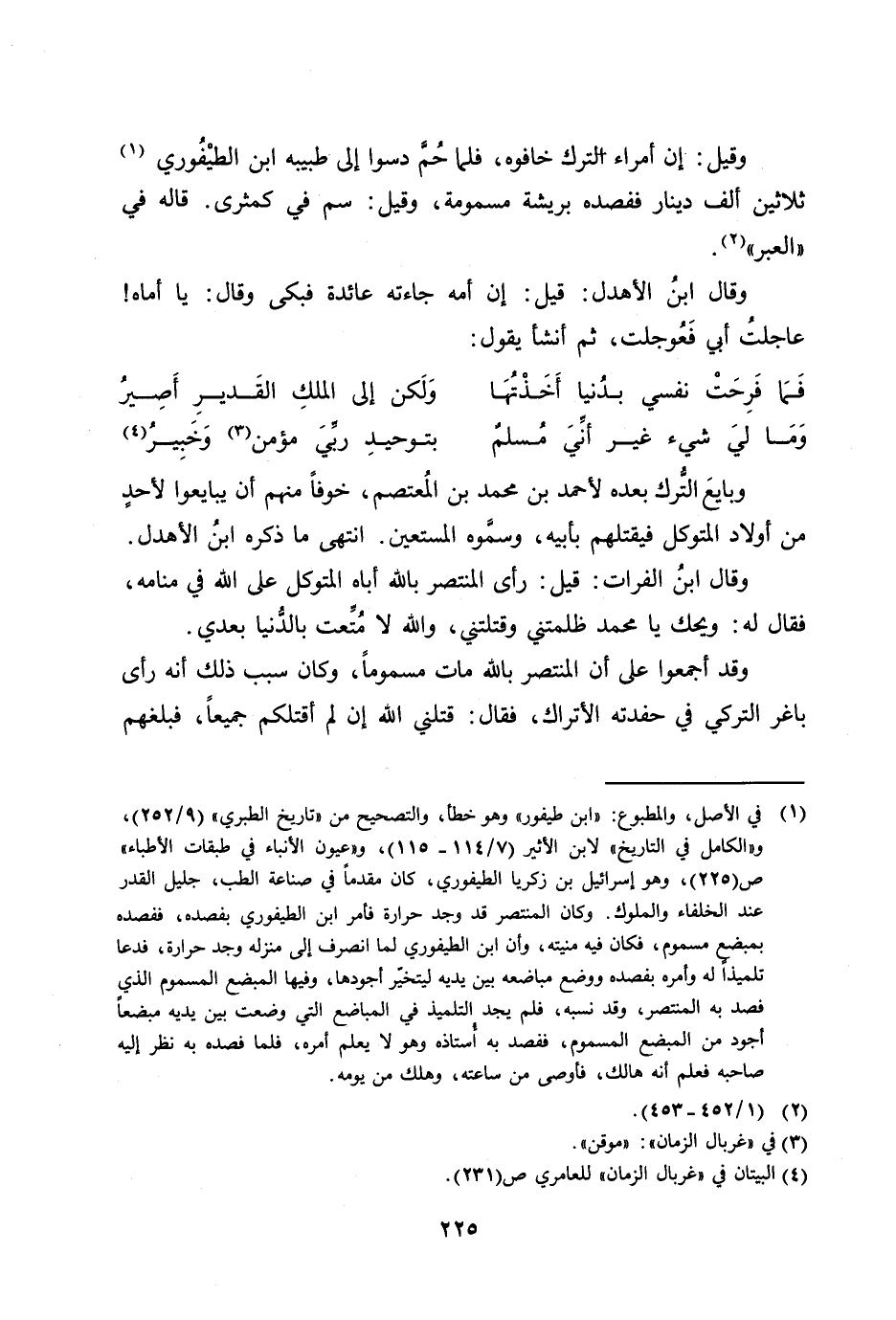 [1] في الأصل، والمطبوع: «ابن طيفور» وهو خطأ، والتصحيح من «تاريخ الطبري» (9/ 252) ، و «الكامل في التاريخ» لابن الأثير (7/ 114- 115) ، و «عيون الأنباء في طبقات الأطباء» ص (225) ، وهو إسرائيل بن زكريا الطيفوري، كان مقدما في صناعة الطب، جليل القدر عند الخلفاء والملوك. وكان المنتصر قد وجد حرارة فأمر ابن الطيفوري بفصده، ففصده بمبضع مسموم، فكان فيه منيته، وأن ابن الطيفوري لما انصرف إلى منزله وجد حرارة، فدعا تلميذا له وأمره بفصده ووضع مباضعه بين يديه ليتخيّر أجودها، وفيها المبضع المسموم الذي فصد به المنتصر، وقد نسبه، فلم يجد التلميذ في المباضع التي وضعت بين يديه مبضعا أجود من المبضع المسموم، ففصد به أستاذه وهو لا يعلم أمره، فلما فصده به نظر إليه صاحبه فعلم أنه هالك، فأوصى من ساعته، وهلك من يومه.