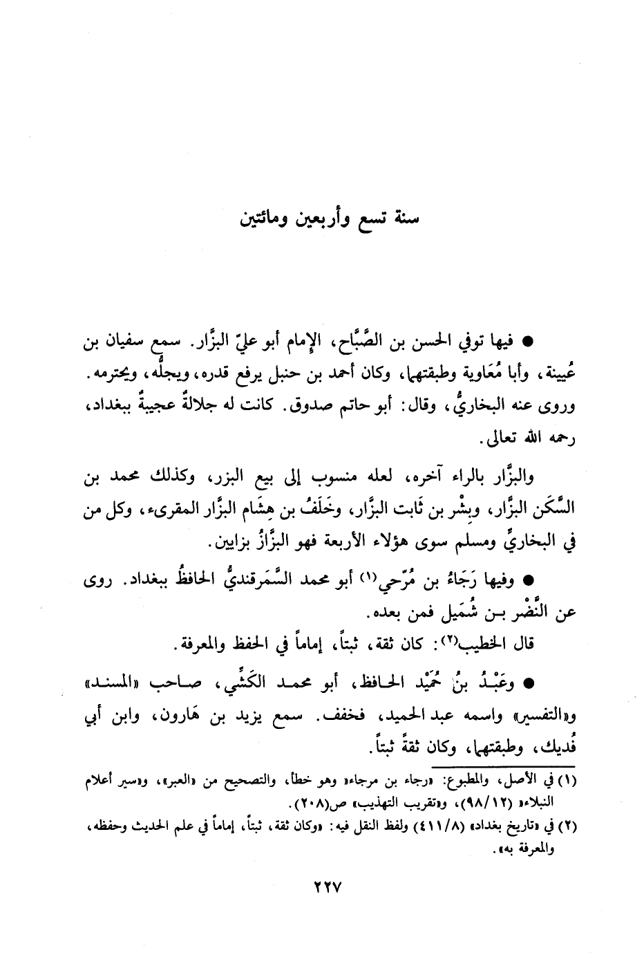 فيها توفي الحسن بن الصّبّاح، الإمام أبو عليّ البزّار. سمع سفيان بن عيينة، وأبا معاوية وطبقتهما، وكان أحمد بن حنبل يرفع قدره، ويجلّه، ويحترمه.