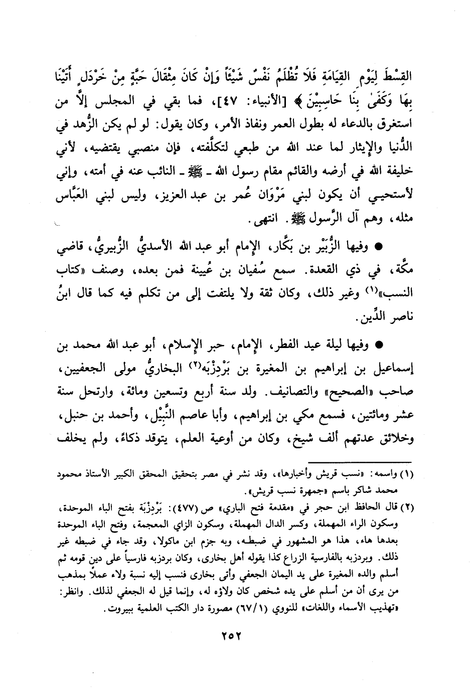 وفيها ليلة عيد الفطر، الإمام، حبر الإسلام، أبو عبد الله محمد بن إسماعيل بن إبراهيم بن المغيرة بن بردزبه [2] البخاريّ مولى الجعفيين، صاحب «الصحيح» والتصانيف. ولد سنة أربع وتسعين ومائة، وارتحل سنة عشر ومائتين، فسمع مكي بن إبراهيم، وأبا عاصم النّبيل، وأحمد بن حنبل، وخلائق عدتهم ألف شيخ، وكان من أوعية العلم، يتوقد ذكاء، ولم يخلف
