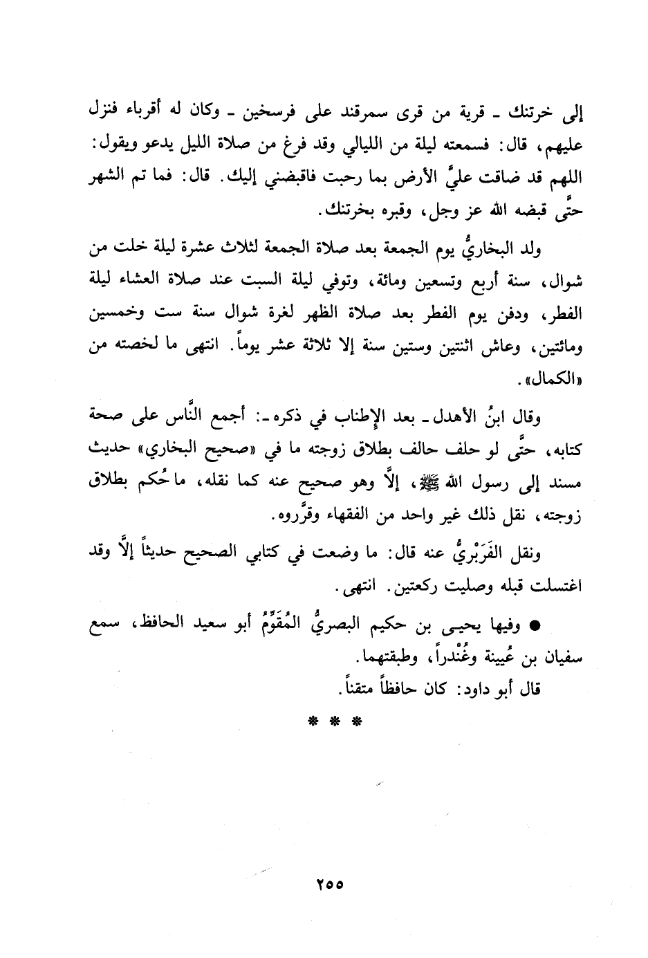 ولد البخاريّ يوم الجمعة بعد صلاة الجمعة لثلاث عشرة ليلة خلت من شوال، سنة أربع وتسعين ومائة، وتوفي ليلة السبت عند صلاة العشاء ليلة الفطر، ودفن يوم الفطر بعد صلاة الظهر لغرة شوال سنة ست وخمسين ومائتين، وعاش اثنتين وستين سنة إلا ثلاثة عشر يوما. انتهى ما لخصته من «الكمال» .