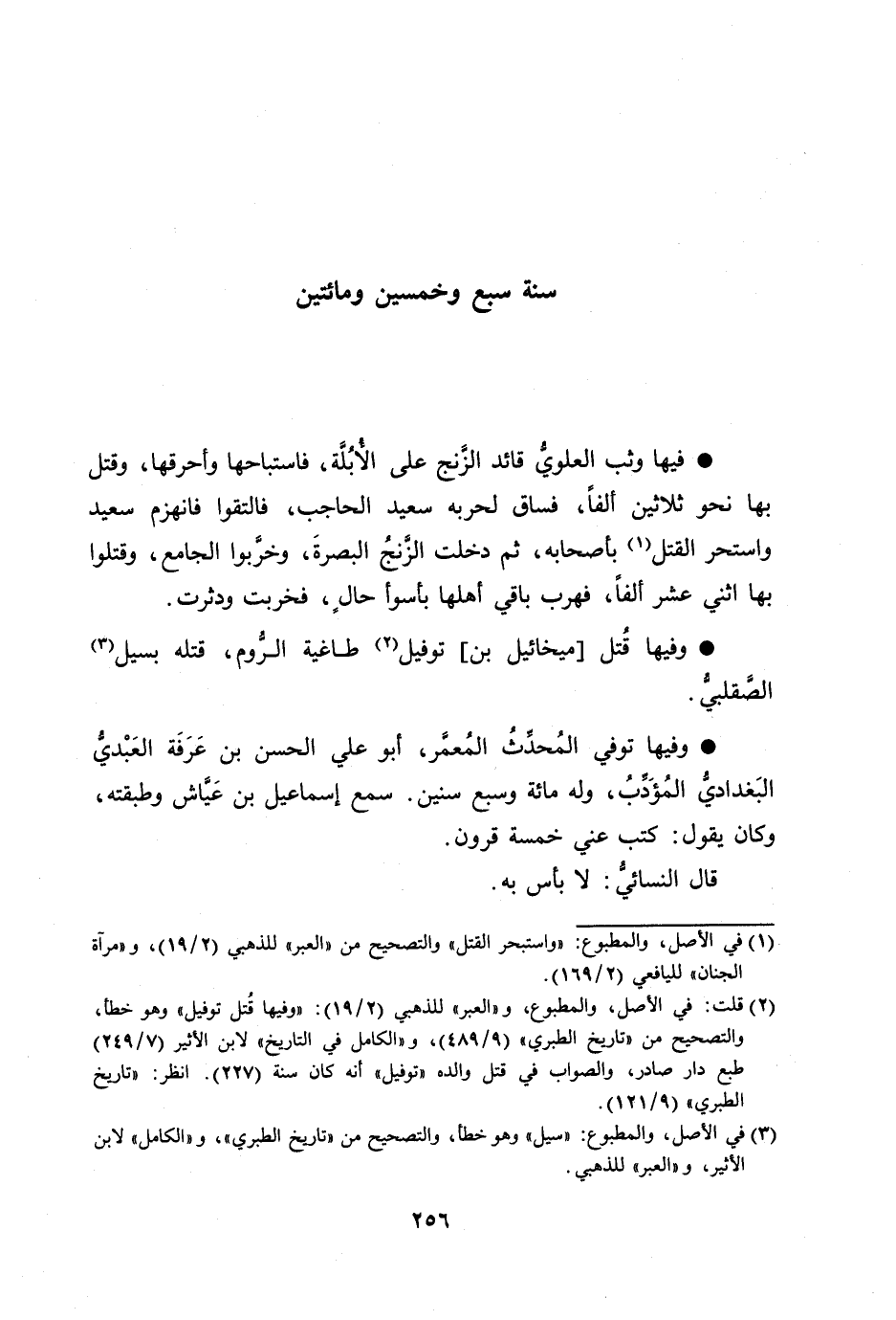 [2] قلت: في الأصل، والمطبوع، و «العبر» للذهبي (2/ 19) : «وفيها قتل توفيل» وهو خطأ، والتصحيح من «تاريخ الطبري» (9/ 489) ، و «الكامل في التاريخ» لابن الأثير (7/ 249) طبع دار صادر، والصواب في قتل والده «توفيل» أنه كان سنة (227) . انظر: «تاريخ الطبري» (9/ 121) .