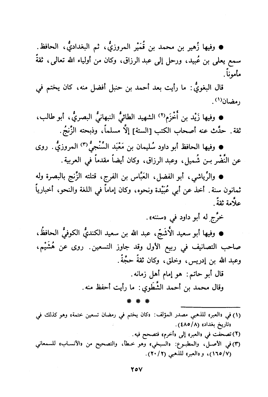[1] في «العبر» للذهبي مصدر المؤلف: «كان يختم في رمضان تسعين ختمة» وهو كذلك في «تاريخ بغداد» (8/ 485) .