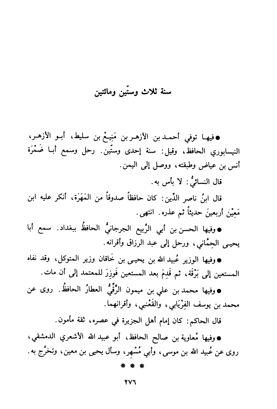 فيها توفي أحمد بن الأزهر بن منيع بن سليط، أبو الأزهر، النيسابوري الحافظ، وقيل: سنة إحدى وستّين. رحل وسمع أبا ضمرة أنس بن عياض وطبقته، ووصل إلى اليمن.