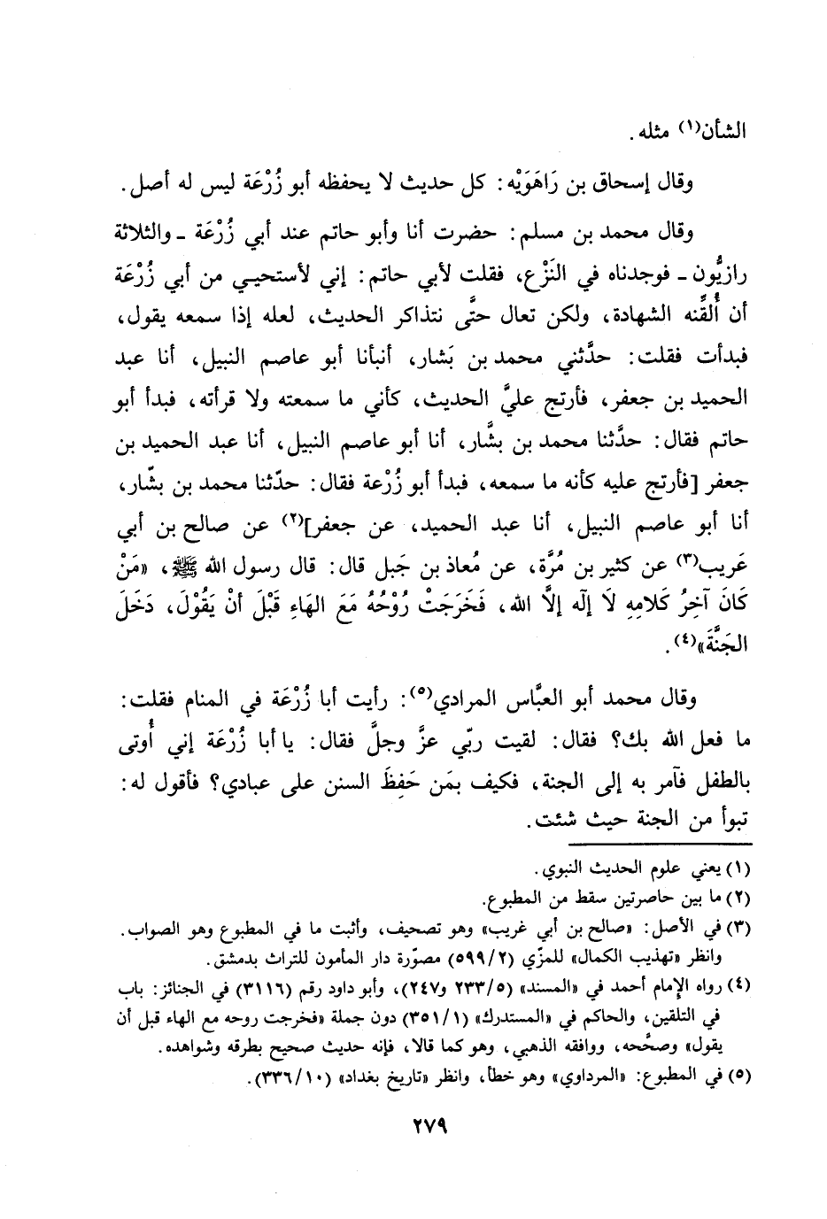 وقال محمد بن مسلم: حضرت أنا وأبو حاتم عند أبي زرعة- والثلاثة رازيّون- فوجدناه في النزع، فقلت لأبي حاتم: إني لأستحيي من أبي زرعة أن ألقّنه الشهادة، ولكن تعال حتّى نتذاكر الحديث، لعله إذا سمعه يقول، فبدأت فقلت: حدّثني محمد بن بشار، أنبأنا أبو عاصم النبيل، أنا عبد الحميد بن جعفر، فأرتج عليّ الحديث، كأني ما سمعته ولا قرأته، فبدأ أبو حاتم فقال: حدّثنا محمد بن بشّار، أنا أبو عاصم النبيل، أنا عبد الحميد بن جعفر [فأرتج عليه كأنه ما سمعه، فبدأ أبو زرعة فقال: حدّثنا محمد بن بشّار، أنا أبو عاصم النبيل، أنا عبد الحميد، عن جعفر] [2] عن صالح بن أبي عريب [3] عن كثير بن مرّة، عن معاذ بن جبل قال: قال رسول الله صلى الله عليه وسلم، «من كان آخر كلامه لا إله إلّا الله، فخرجت روحه مع الهاء قبل أن يقول، دخل الجنّة» [4] . وقال محمد أبو العبّاس المرادي [5] : رأيت أبا زرعة في المنام فقلت: