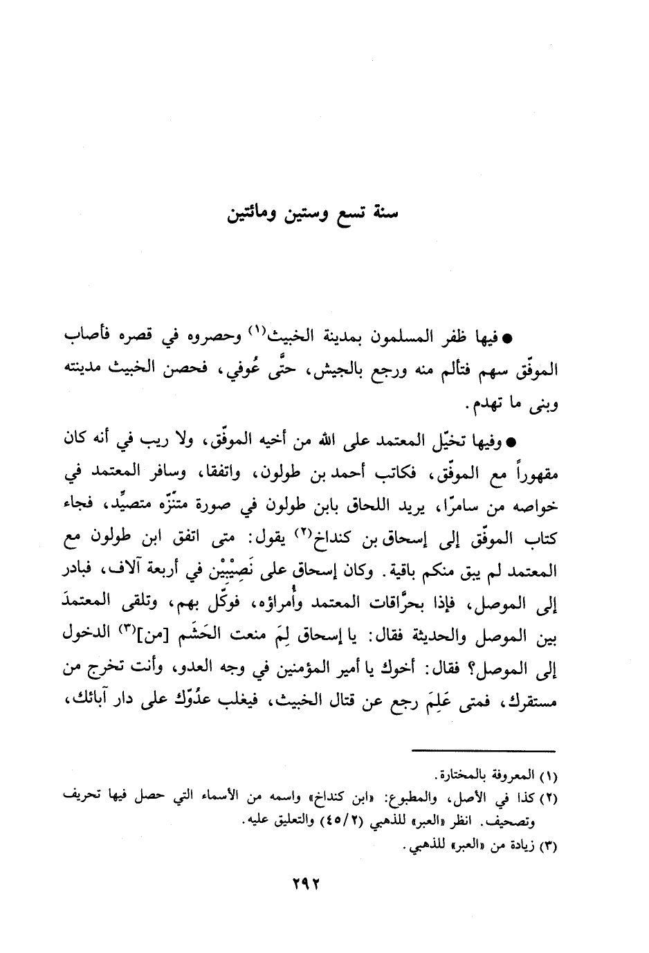 وفيها تخيّل المعتمد على الله من أخيه الموفّق، ولا ريب في أنه كان مقهورا مع الموفّق، فكاتب أحمد بن طولون، واتفقا، وسافر المعتمد في خواصه من سامرّا، يريد اللحاق بابن طولون في صورة متنزّه متصيّد، فجاء كتاب الموفّق إلى إسحاق بن كنداخ [2] يقول: متى اتفق ابن طولون مع المعتمد لم يبق منكم باقية. وكان إسحاق على نصيبين في أربعة آلاف، فبادر إلى الموصل، فإذا بحرّاقات المعتمد وأمراؤه، فوكّل بهم، وتلقى المعتمد بين الموصل والحديثة فقال: يا إسحاق لم منعت الحشم [من] [3] الدخول إلى الموصل؟ فقال: أخوك يا أمير المؤمنين في وجه العدو، وأنت تخرج من مستقرك، فمتى علم رجع عن قتال الخبيث، فيغلب عدوّك على دار آبائك،