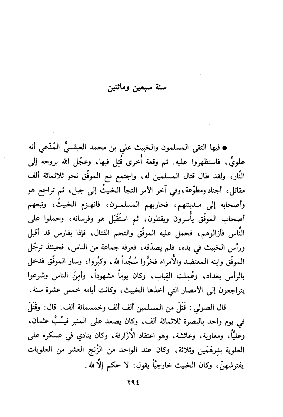 فيها التقى المسلمون والخبيث علي بن محمد العبقسيّ المدّعي أنه علويّ، فاستظهروا عليه. ثم وقعة أخرى قتل فيها، وعجّل الله بروحه إلى النّار، ولقد طال قتال المسلمين له، واجتمع مع الموفّق نحو ثلاثمائة ألف مقاتل، أجناد ومطوّعة، وفي آخر الأمر التجأ الخبيث إلى جبل، ثم تراجع هو وأصحابه إلى مدينتهم، فحاربهم المسلمون، فانهزم الخبيث، وتبعهم أصحاب الموفّق يأسرون ويقتلون، ثم استقبل هو وفرسانه، وحملوا على النّاس فأزالوهم، فحمل عليه الموفّق والتحم القتال، فإذا بفارس قد أقبل ورأس الخبيث في يده، فلم يصدّقه، فعرفه جماعة من الناس، فحينئذ ترجّل الموفّق وابنه المعتضد والأمراء فخرّوا سجّدا لله، وكبّروا، وسار الموفّق فدخل بالرأس بغداد، وعملت القباب، وكان يوما مشهودا، وأمن الناس وشرعوا يتراجعون إلى الأمصار التي أخذها الخبيث، وكانت أيامه خمس عشرة سنة.
